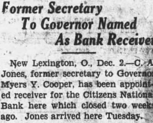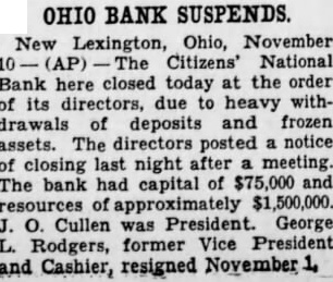 OHIO BANK SUSPENDS. New Lexington, Ohio, November Citizens National Bank here today the of its to heavy with of deposits and frozen The notice closing last night after meeting The bank had capital of $75,000 and $1,500,000 O. Cullen President George Rodgers, former President and Cashier, resigned November 1,