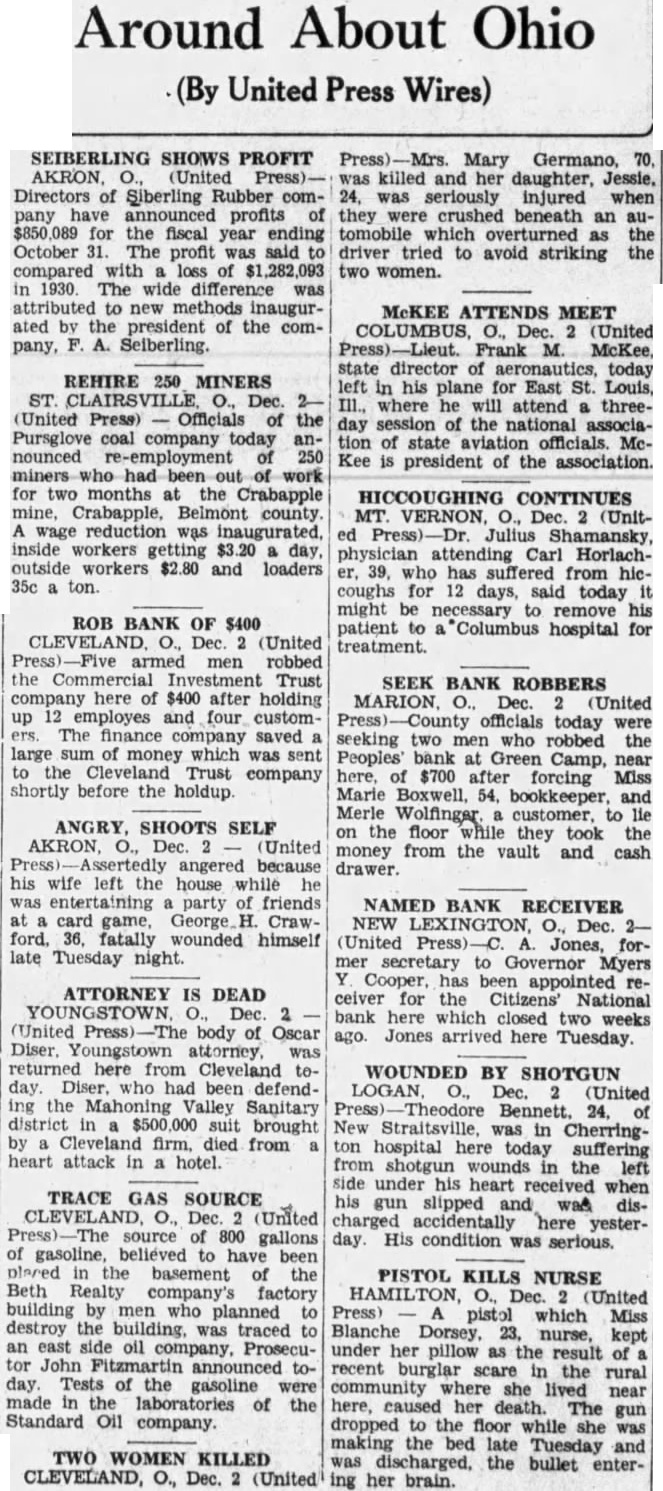 Around About Ohio United Press Wires) SEIBERLING SHOWS PROFIT (United Directors of Siberling Rubber company profits for the fiscal year ending October The profit was said compared with loss in difference was to inaugurated by the president the company, Seiberling. REHIRE 250 MINERS ST Dec. (United Officials of the Pursglove coal company today nounced re-employment been for two months the Crabapple mine, Crabapple, Belmont county wage reduction inaugurated, inside workers getting outside workers $2.80 and loaders 35c ROB BANK OF $400 CLEVELAND. Dec. (United armed men robbed the Investment Trust company here $400 after holding up employes four customThe finance company saved large money which sent the Cleveland Trust company shortly before the holdup. ANGRY, SHOOTS SELF AKRON, Dec. (United angered because his wife house while entertaining party friends card game, George Crawford, 36, fatally wounded himself late Tuesday night. ATTORNEY IS DEAD YOUNGSTOWN Dec. (United body of Oscar Youngstown attorney was returned here from Cleveland day. Diser. who had been defendMahoning Valley Sanitary district suit brought Cleveland firm, died from heart attack in hotel. TRACE SOURCE (United source 800 gallons of gasoline, believed to have been placed basement the Beth Realty company's factory building by men planned destroy the building, traced an east oil company, Prosecutor John Fitzmartin announced today. Tests of gasoline were made laboratories of the Standard Oil company. TWO WOMEN KILLED CLEVELAND, Dec. (United Mary Germano, 70. killed and her daughter, Jessie, was seriously injured when they were crushed beneath an tomobile which overturned the driver to avoid striking two women. McKEE ATTENDS MEET Dec. (United Frank McKee. state director of aeronautics, today his plane for East St. Louis, where he will attend threeday session of the national association of state aviation officials. McKee president of the association. HICCOUGHING CONTINUES MT. VERNON, Dec. (UnitJulius Shamansky, physician attending Carl Horlachhas suffered from hiccoughs for days, said today might be necessary remove his patient to Columbus hospital for treatment. SEEK BANK ROBBERS MARION (United officials today were seeking two men who robbed the bank at Green Camp, here, of $700 after forcing Miss Marie 54, bookkeeper, and Merle Wolfinger customer, on the floor they took the money from the vault and cash drawer. NAMED BANK RECEIVER NEW Dec. (United forsecretary to Myers Cooper, has been appointed ceiver for the Citizens' National bank here which closed two weeks ago. Jones arrived here Tuesday WOUNDED BY SHOTGUN (United New Straitsville, in Cherringhospital here today suffering from shotgun wounds in the left side under heart received when his gun slipped and discharged here yesterday. His condition was serious. PISTOL KILLS NURSE HAMILTON, O., Dec. (United pistol which Blanche nurse, kept under her the result recent burglar the rural community where she lived near here, her death. The dropped the floor while making the bed late Tuesday and the bullet enterher brain.
