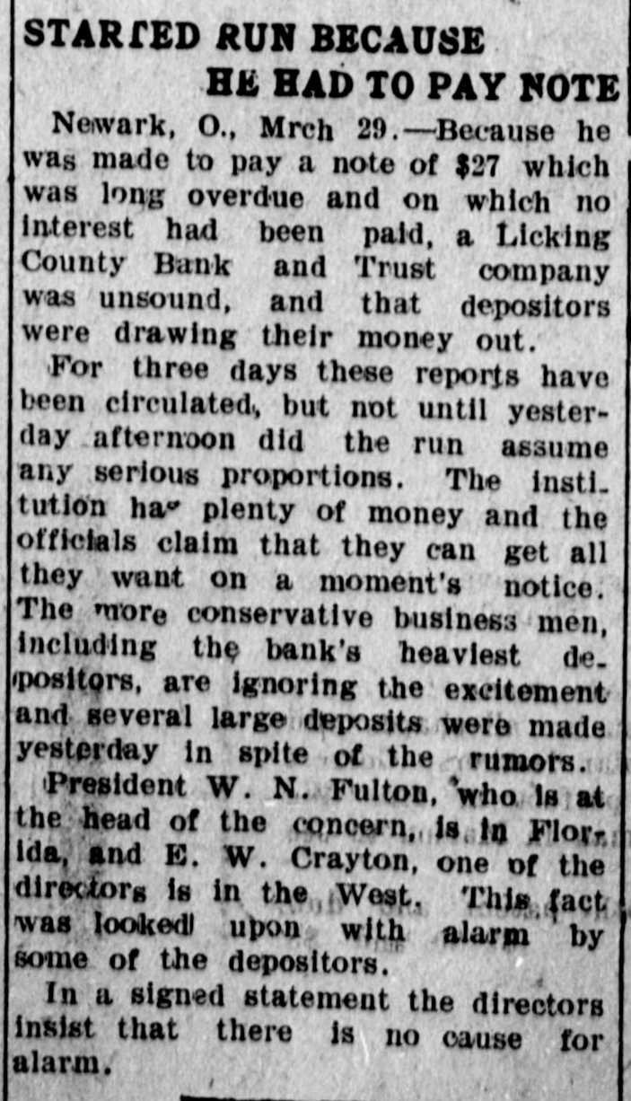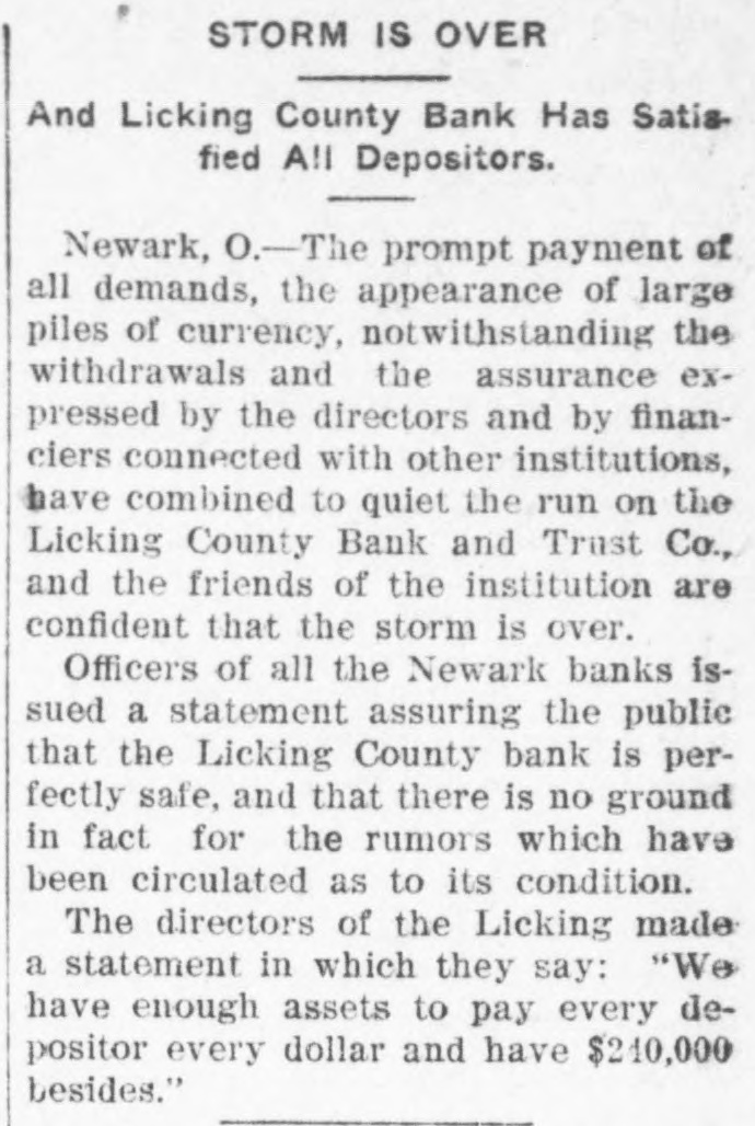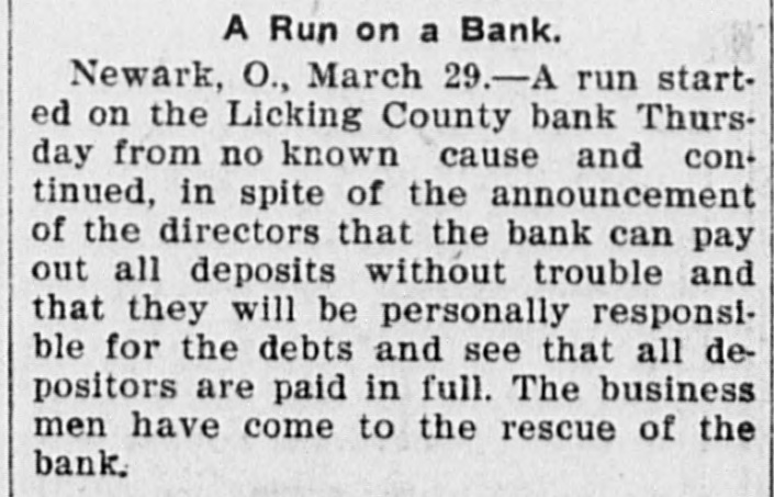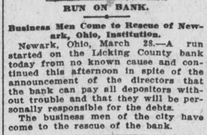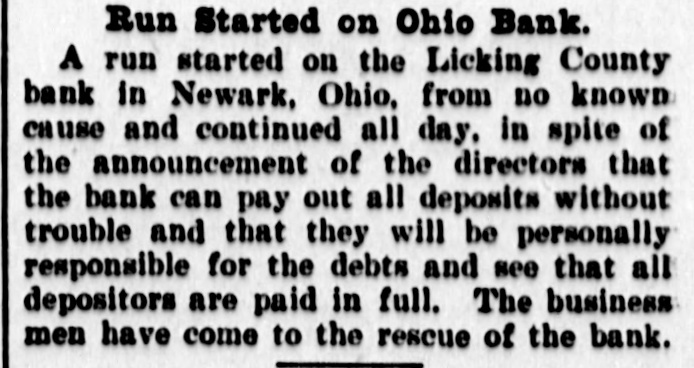 A run started on the Licking county bank at Newark, Ohio, from no known cause, and continued in spite of the announcement of the directors that the bank could pay all deposits. Business men came to the rescue.