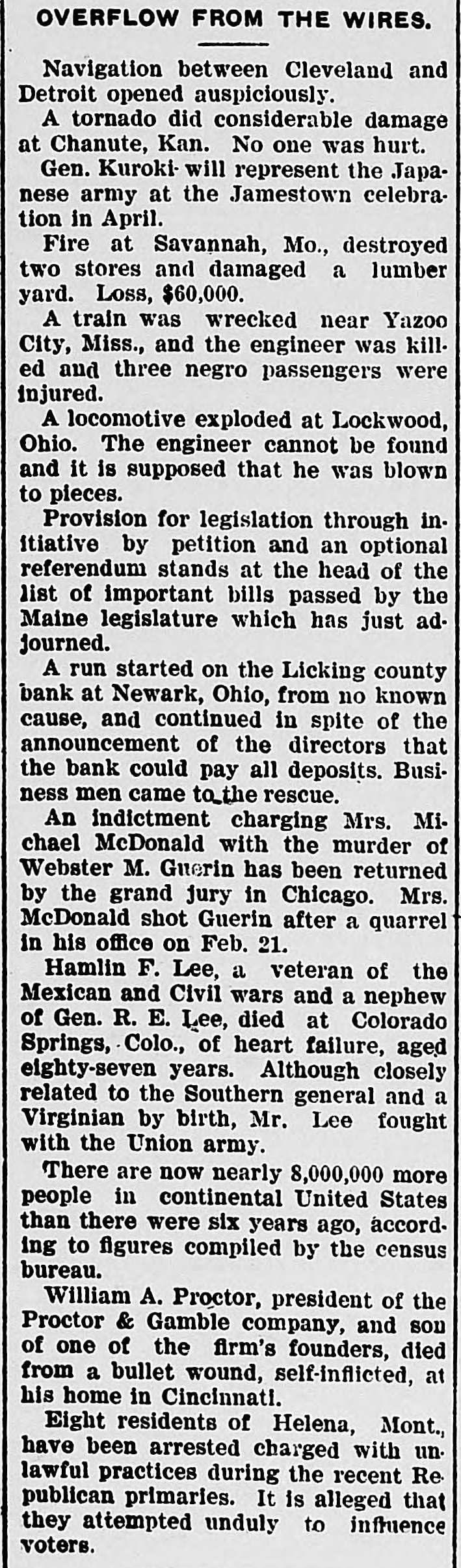 William A. Proctor, president of the Proctor & Gamble company, and son of one of the firm's founders, died from a bullet wound, self-inflicted, at his home in Cincinnati.