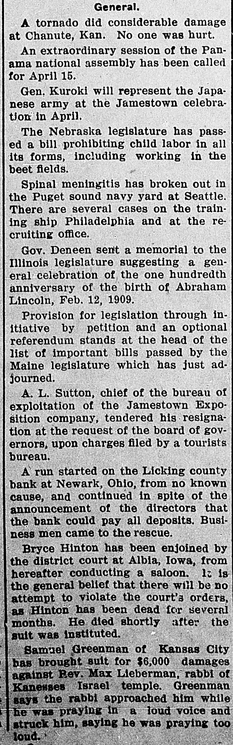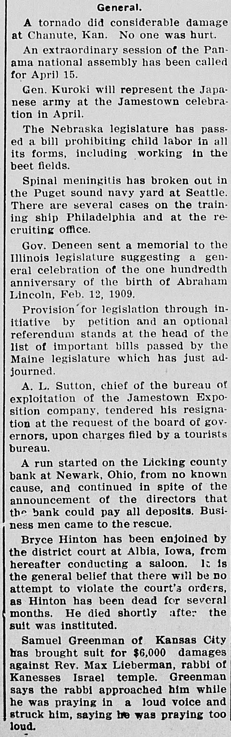 A locomotive exploded at Lockwood, Ohio. The engineer cannot be found and it is supposed that he was blown to pieces.