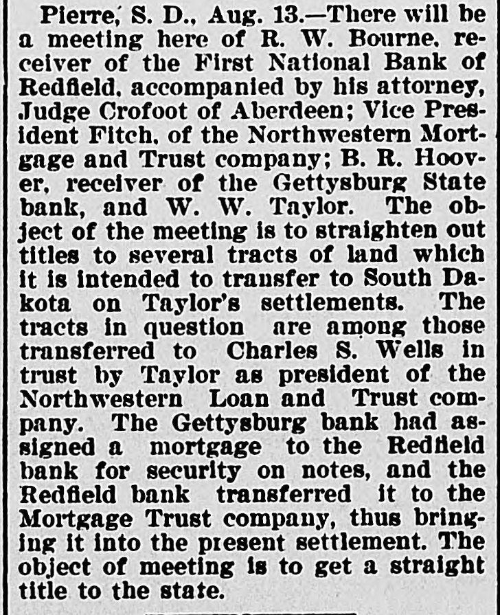 THE CITY. LOCAL BREVITIES. B. E. Beers returned to Easton, Minn. I. D. Smith was a passenger for Iowa points. Miss Laura Fuller went to Vilas on the evening train. John Miller went to Flandreau on a visit to old acquaintances. S. E. Baldwin always keeps a good supply of Dwight's flour in stock. The town has been billed to day for Lemen's circus which shows here September 3. Weather report: Fair, followed by increasing cloudiness to-night and Friday Warmer to-night and Friday; southerly winds. New wheat begins to move. One car load came east to-day from Artesian, two carloads from Howard and six were sent out from Flandreau. Arrivals at the Lake Park are: Court Boyd, Huron; L. P. Comstock and D. Webster, Aberdeen; John Stewart, Minneapolis; W. H. Tarbox, La Crosse. In the advertised letter list last evening, the name of J. E. Tanner appeared when it should have been J. E. Tamer. There are several letters in the postoffice for the gentleman which will be sent to the dead letter office unless called for within the regulation time. Rev. W. J. Cleveland received a telegram last evening announcing the death of Willis Leiby who, it will be remembered, spent some time with his wife in the family of Mr. Cleveland last spring. He died at Hamberg, Pa., among friends, and was the victim of consumption. Iver Hyland of the north east part of county who returned from the asylum at Yankton some two months ago IS again partially violent and in charge of Sheriff Fox. Judge Williamson to-day notified the asylum authorities of his condition and he will probably soon be cared for. Mitchell Republican, 12: "Miss Marion L. Krom has just finished a course of study at the Cook County Normal school, Chicago. She is now visiting with friends at Perrysburg, Ohio." Miss Krom was a graduate of the Madison Normal school, class of '93. Train Dispatcher H. R. Wood and as sistant, J. E. Hickey, have control of the wires at the depot to day and John Moore started for LaCrosse. Mr. Wood says there will soon be a change in time table and an abandonment of mixed trains, which will be very agreeable to the traveling public. Langdon, N. D., dispatch, 14: A. H. Garfield' the Aberdeen, S. D., music dealer who eloped with 16-year-old Bessie Moore, of that city, arrived on the 6 o'clock train last night and at once hired a livery rig aud started for Manitou, Manitoba, about 35 miles ditant, on the Northern Pacific railroad. Garfield had shaved off bis beard and appeared fearful of arrest. Six local wheel sprinters took a spurt to Wentworth and back-a distance of 16 miles round trip-last evening. Martin Johnson was handicapped 8 minutes as against Harry Hunt and SIX minutes as against the others-Wm. Rae, Ivan Hubbell, Bert Holdridge and Frank Smith. The riding was fast and furious, Rae coming in ahead in 56:57, with the others close behind, except Smith who "bust" his wheel in a rut two or three miles from Wentworth. Johnson, however, made best time, 55:35. Some of the boys were pretty badly spavined and ringboned when they returned and have needed considerable rubbing down to keep them limber since. Pierre dispatch, 14: The receivers of the First National Bank of Redfield, and of the Gettysburg State Bank, accompanied by their attorneys, Vice President Fitch, of the Northwestern Mortgage Trust Co., and W. W. Taylor, have been attempting for several days to come to somr kind of an agreement in regard to some of the lands turned in by Taplor in settlement with the state. They failed to accomplish the purpose for which they came here. Just what they expected to do they do not divulge. but it eus. pected that they were attempting to get some of the property losse thatit might be used as proceeds of the Redfield bank. The attorney general, evidently 'could not see any object to be attained by the state in releasing an attachment, neither did the receiver of the Gettysburg bank care to let go his hold on the property in his possession, and what on the surface