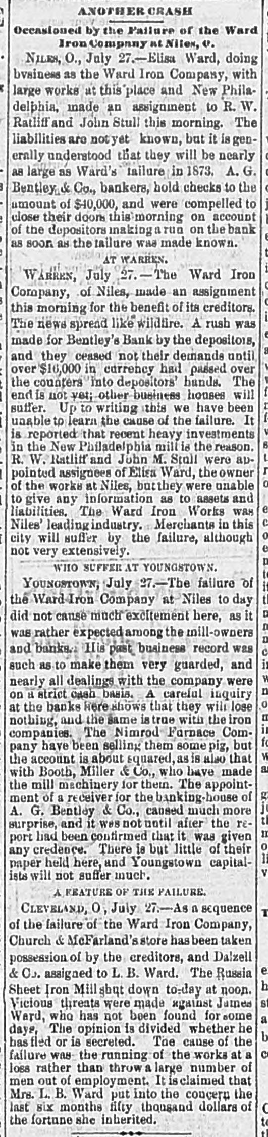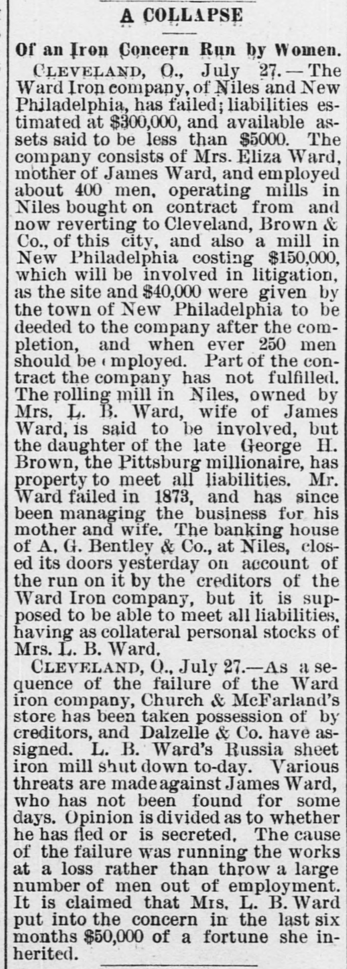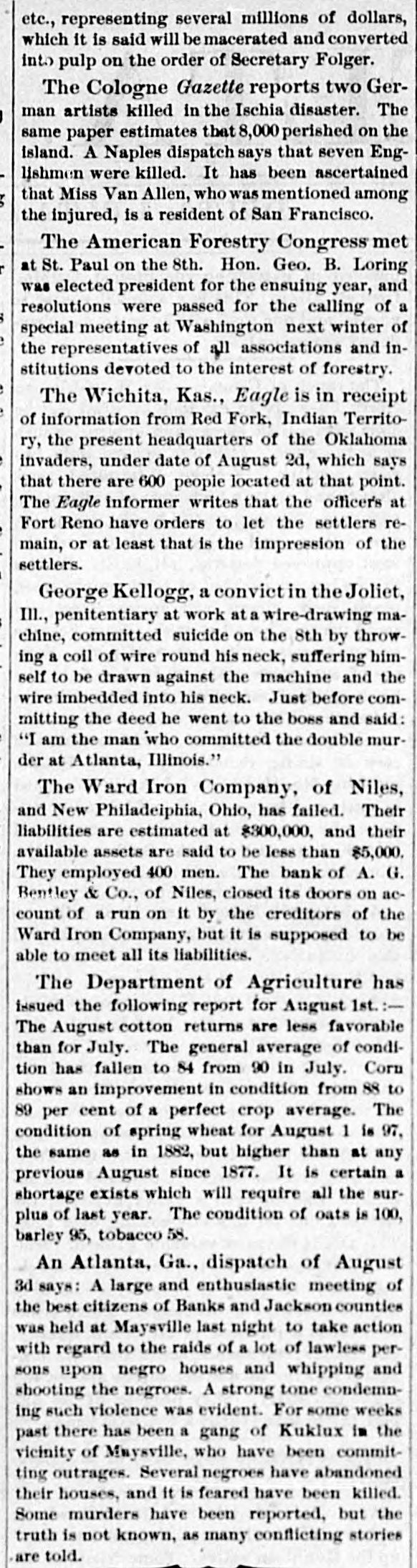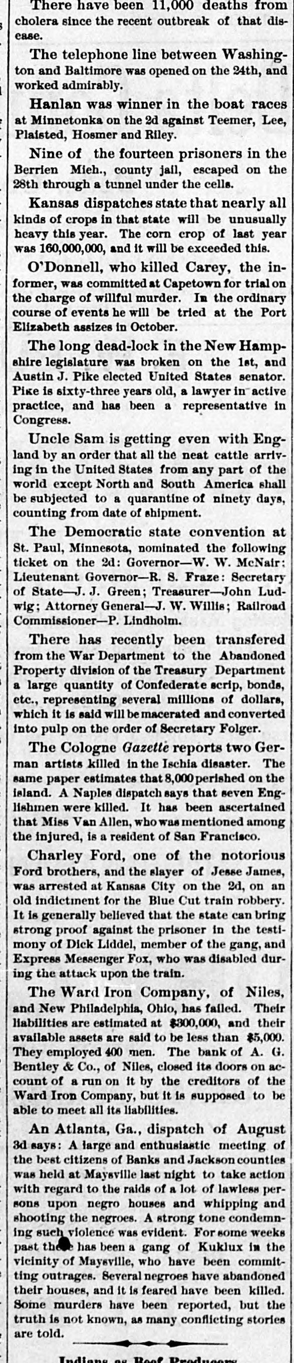 There have been 11,000 deaths from cholera since the recent outbreak of that disease. The telephone line between Washington and Baltimore was opened on the 24th, and worked admirably. Hanlan was winner in the boat races at Minnetonka on the 2d against Teemer, Lee, Plaisted, Hosmer and Riley. Nine of the fourteen prisoners in the Berrien Mich., county jail, escaped on the 28th through a tunnel under the cells. Kansas dispatches state that nearly all kinds of crops in that state will be unusually heavy this year. The corn crop of last year was 160,000,000, and it will be exceeded this. O'Donnell, who killed Carey, the informer, was committed at Capetown for trial on the charge of willful murder. In the ordinary course of events he will be tried at the Port Elizabeth assizes in October. The long dead-lock in the New Hampshire legislature was broken on the 1st, and Austin J. Pike elected United States senator. Pike is sixty-three years old, a lawyer in active practice, and has been a representative in Congress. Uncle Sam is getting even with England by an order that all the neat cattle arriving in the United States from any part of the world except North and South America shall be subjected to a quarantine of ninety days, counting from date of shipment. The Democratic state convention at St. Paul, Minnesota, nominated the following ticket on the 2d: Governor-W. W. McNair: Lieutenant Governor-R. S. Fraze: Secretary of State-J. J. Green; Treasurer-John Ludwig; Attorney General-J. W. Willis; Railroad Commissioner-P. Lindholm. There has recently been transfered from the War Department to the Abandoned Property division of the Treasury Department a large quantity of Confederate scrip, bonds, etc., representing several millions of dollars, which it is said will be macerated and converted into pulp on the order of Secretary Folger. The Cologne Gazette reports two German artists killed in the Ischia disaster. The same paper estimates that 8,000 perished on the island. A Naples dispatch says that seven Englishmen were killed. It has been ascertained that Miss Van Allen, who was mentioned among the injured, is a resident of San Francisco. Charley Ford, one of the notorious Ford brothers, and the slayer of Jesse James, was arrested at Kansas City on the 2d, on an old indictment for the Blue Cut train robbery. It is generally believed that the state can bring strong proof against the prisoner in the testimony of Dick Liddel, member of the gang, and Express Messenger Fox, who was disabled during the attack upon the train. The Ward Iron Company, of Niles, and New Philadelphia, Ohio, has failed. Their liabilities are estimated at $300,000, and their available assets are said to be less than $5,000. They employed 400 men. The bank of A. G. Bentley & Co., of Niles, closed its doors on account of a run on it by the creditors of the Ward Iron Company, but it is supposed to be able to meet all its liabilities. An Atlanta, Ga., dispatch of August 3d says: A large and enthusiastic meeting of the best citizens of Banks and Jackson counties was held at Maysville last night to take action with regard to the raids of a lot of lawless persons upon negro houses and whipping and shooting the negroes. A strong tone condemning such violence was evident. For some weeks past th has been a gang of Kuklux in the vicinity of Mayeville, who have been committing outrages. Several negroes have abandoned their houses, and it is feared have been killed. Some murders have been reported, but the truth is not known, as many conflicting stories are told. Indiana Draduanm