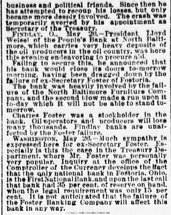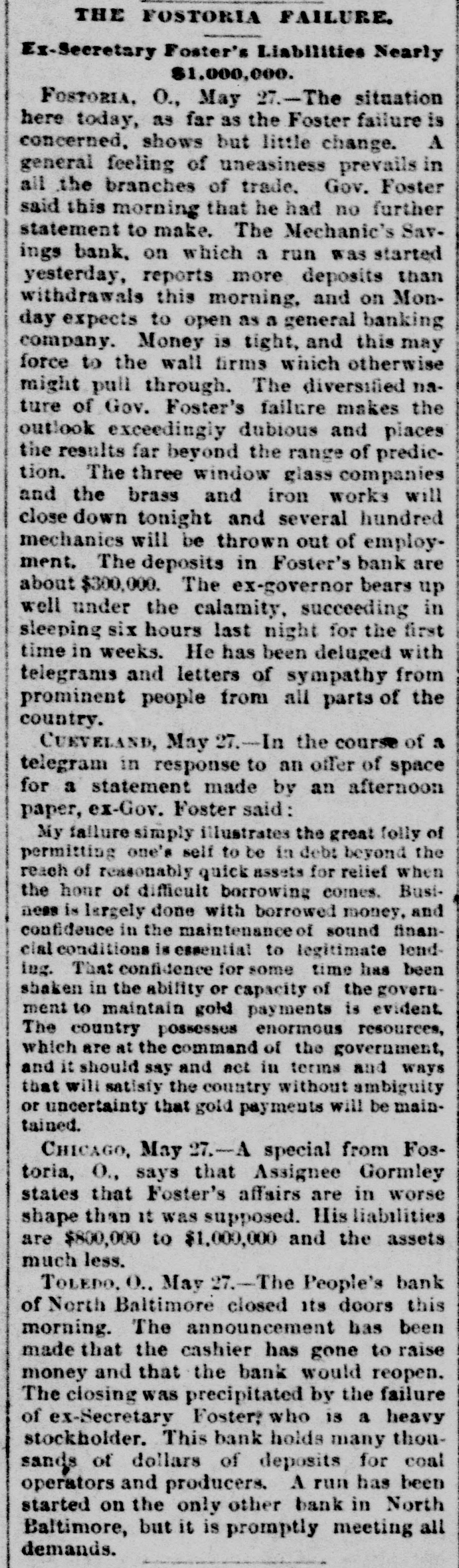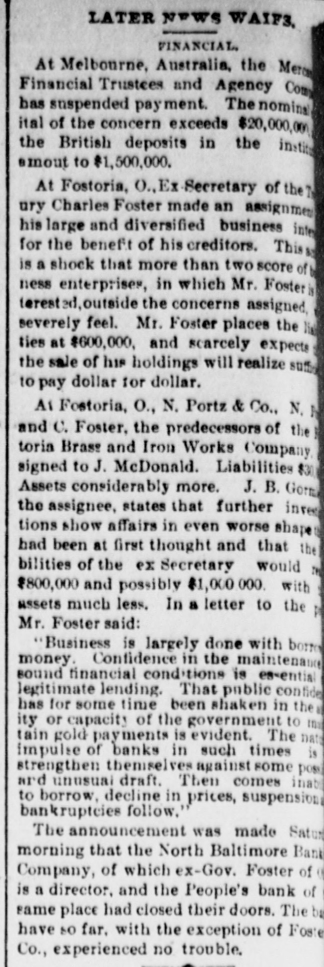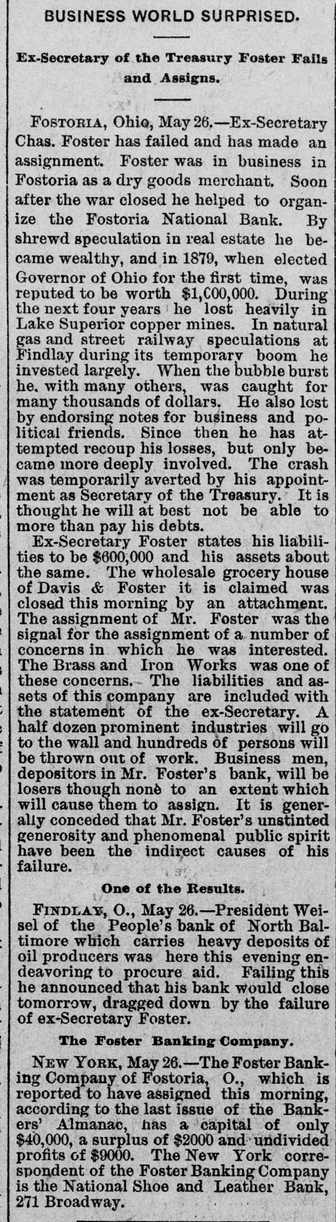 BUSINESS WORLD SURPRISED. Ex-Secretary of the Treasury Foster Fails and Assigns. FOSTORIA, Ohie, May 26.-Ex-Secretary Chas. Foster has failed and has made an assignment. Foster was in business in Fostoria as a dry goods merchant. Soon after the war closed he helped to organize the Fostoria National Bank. By shrewd speculation in real estate he became wealthy, and in 1879, when elected Governor of Ohio for the first time, was reputed to be worth $1,000,000. During the next four years he lost heavily in Lake Superior copper mines. In natural gas and street railway speculations at Findlay during its temporary boom he invested largely. When the bubble burst he, with many others, was caught for many thousands of dollars. He also lost by endorsing notes for business and political friends. Since then he has attempted recoup his losses, but only became more deeply involved. The crash was temporarily averted by his appointment as Secretary of the Treasury. It is thought he will at best not be able to more than pay his debts. Ex-Secretary Foster states his liabilities to be $600,000 and his assets about the same. The wholesale grocery house of Davis & Foster it is claimed was closed this morning by an attachment. The assignment of Mr. Foster was the signal for the assignment of a number of concerns in which he was interested. The Brass and Iron Works was one of these concerns.- The liabilities and assets of this company are included with the statement of the ex-Secretary. A half dozen prominent industries will go to the wall and hundreds of persons will be thrown out of work. Business men, depositors in Mr. Foster's bank, will be losers though none to an extent which will cause them to assign. It is generaliy conceded that Mr. Foster's unstinted generosity and phenomenal public spirit have been the indirect causes of his failure. One of the Results. FINDLAY, O., May 26.-President Weisel of the People's bank of North Baltimore which carries heavy deposits of oil producers was here this evening endeavoring to procure aid. Failing this he announced that his bank would close tomorrow, dragged down by the failure of ex-Secretary Foster. The Foster Banking Company. NEW YORK, May 26.-The - Foster Banking Company of Fostoria, O., which is reported to have assigned this morning, according to the last issue of the Bankers' Almanac, has a capital of only $40,000, a surplus of $2000 and undivided profits of $9000. The New York correspondent of the Foster Banking Company is the National Shoe and Leather Bank, 271 Broadway.