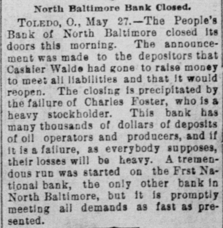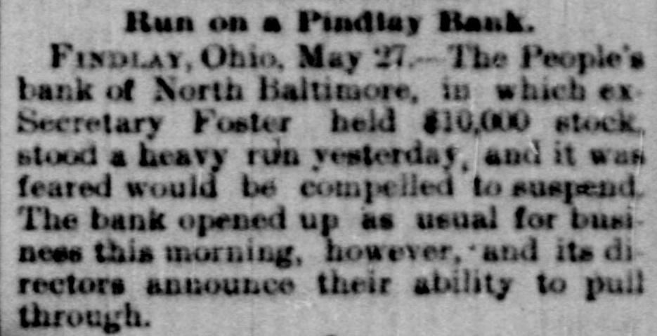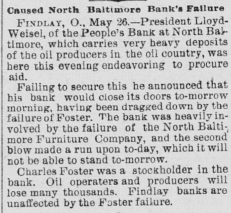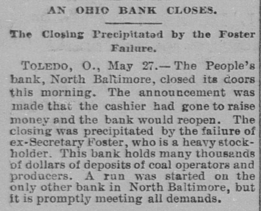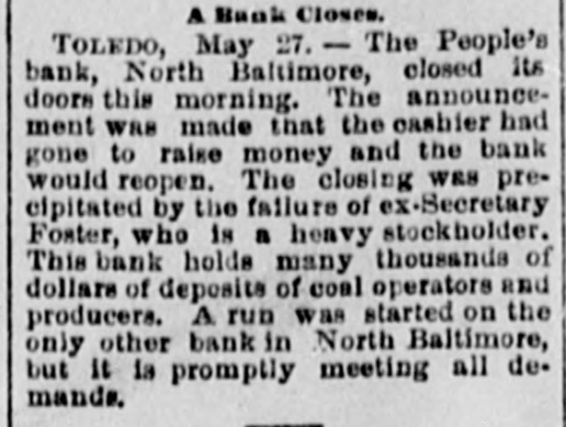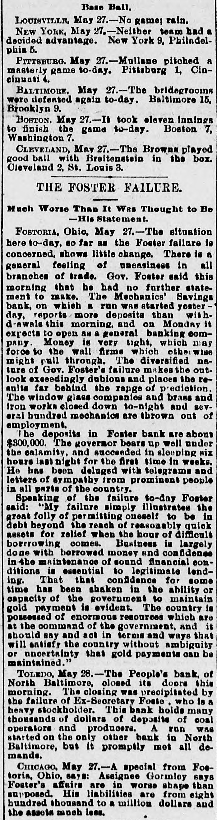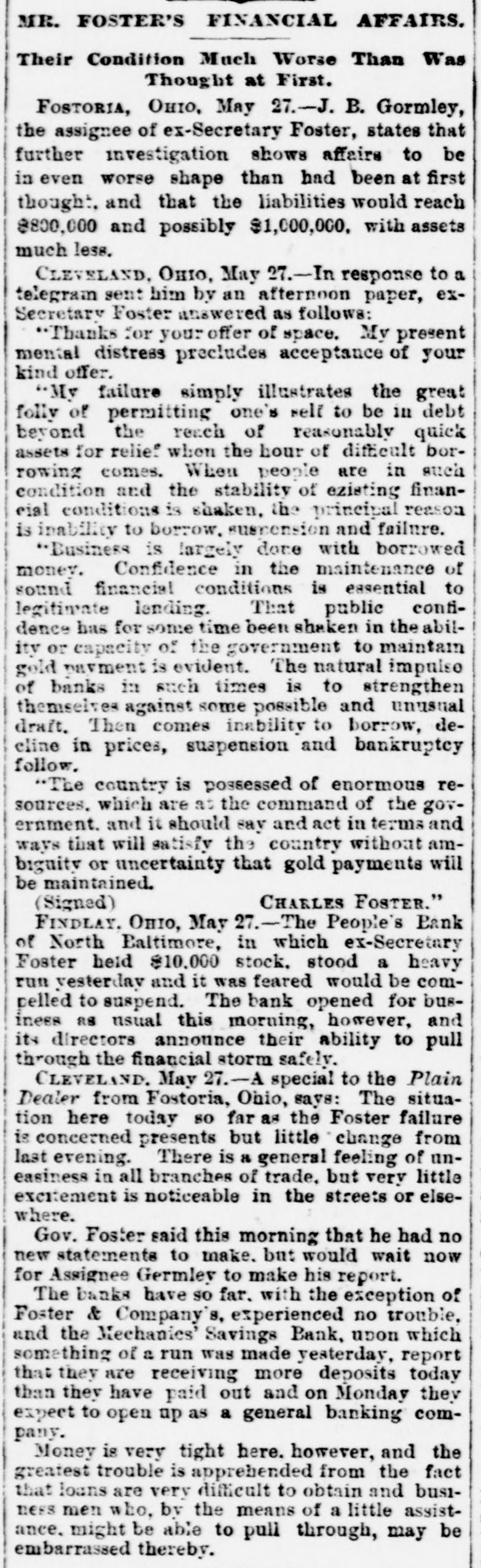 BUSINESS WORLD SURPRISED. Ex-Secretary of the Treasury Foster Fails and Assigns. FOSTORIA, Ohie, May 26.-Ex-Secretary Chas. Foster has failed and has made an assignment. Foster was in business in Fostoria as a dry goods merchant. Soon after the war closed he helped to organize the Fostoria National Bank. By shrewd speculation in real estate he became wealthy, and in 1879, when elected Governor of Ohio for the first time, was reputed to be worth $1,000,000. During the next four years he lost heavily in Lake Superior copper mines. In natural gas and street railway speculations at Findlay during its temporary boom he invested largely. When the bubble burst he, with many others, was caught for many thousands of dollars. He also lost by endorsing notes for business and political friends. Since then he has attempted recoup his losses, but only became more deeply involved. The crash was temporarily averted by his appointment as Secretary of the Treasury. It is thought he will at best not be able to more than pay his debts. Ex-Secretary Foster states his liabilities to be $600,000 and his assets about the same. The wholesale grocery house of Davis & Foster it is claimed was closed this morning by an attachment. The assignment of Mr. Foster was the signal for the assignment of a number of concerns in which he was interested. The Brass and Iron Works was one of these concerns.- The liabilities and assets of this company are included with the statement of the ex-Secretary. A half dozen prominent industries will go to the wall and hundreds of persons will be thrown out of work. Business men, depositors in Mr. Foster's bank, will be losers though none to an extent which will cause them to assign. It is generaliy conceded that Mr. Foster's unstinted generosity and phenomenal public spirit have been the indirect causes of his failure. One of the Results. FINDLAY, O., May 26.-President Weisel of the People's bank of North Baltimore which carries heavy deposits of oil producers was here this evening endeavoring to procure aid. Failing this he announced that his bank would close tomorrow, dragged down by the failure of ex-Secretary Foster. The Foster Banking Company. NEW YORK, May 26.-The - Foster Banking Company of Fostoria, O., which is reported to have assigned this morning, according to the last issue of the Bankers' Almanac, has a capital of only $40,000, a surplus of $2000 and undivided profits of $9000. The New York correspondent of the Foster Banking Company is the National Shoe and Leather Bank, 271 Broadway.