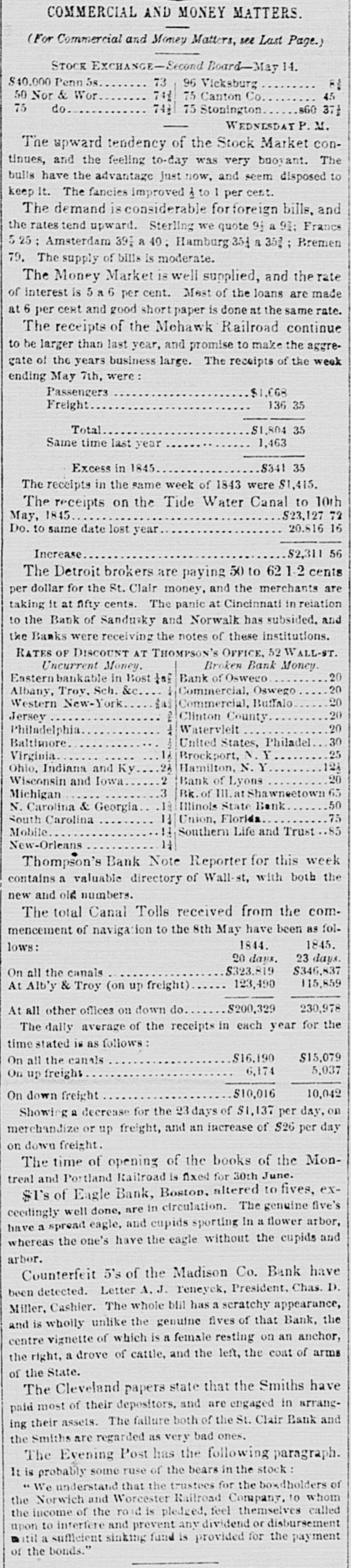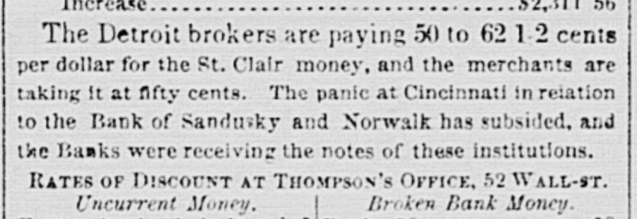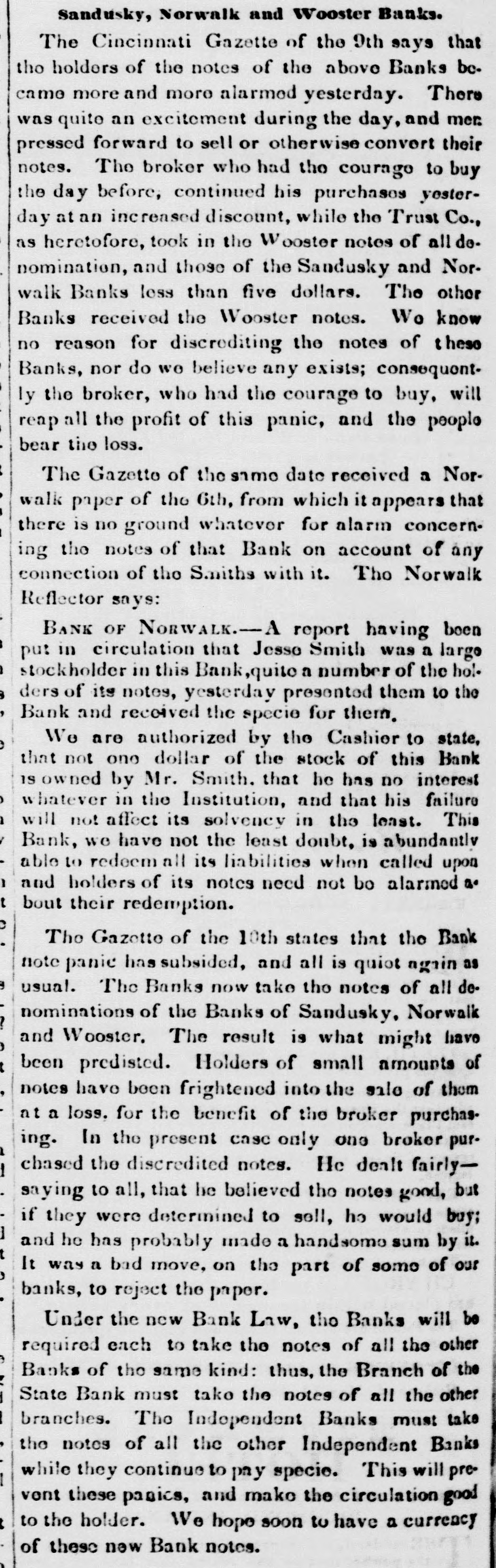 Sandusky, Norwalk and Wooster Banks. The Cincinnati Gazette of the 9th says that tho holders of the notes of the above Banks bc. came more and more alarmed yesterday. There was quite an excitement during the day, and men. pressed forward to sell or otherwise convert their notes. The broker who had the courage to buy the day before, continued his purchases yesterday at an increased discount, while the Trust Co., as heretofore, took in the Wooster notes of all do. nomination, and those of the Sandusky and Norwalk Banks less than five dollars. The other Banks received the Wooster notes. Wo know no reason for discrediting the notes of these Banks, nor do we believe any exists; consequently the broker, who had the courage to buy, will reap all the profit of this panic, and the people bear the loss. The Gazette of the same date received a Norwalk paper of the 6th, from which it appears that there is no ground whatever for alarm concerning the notes of that Bank on account of any connection of the Smiths with it. Tho Norwalk Reflector says: BANK OF NORWALK.--A report having been put in circulation that Jesso Smith was a largo stockholder in this Bank, quite a number of the holders of its notes, yesterday presented them to the Bank and received the specie for them. We are authorized by the Cashier to state, that not one dollar of the stock of this Bank is owned by Mr. Smith. that he has no interest whatever in the Institution, and that his failure will not affect its solvency in the least. This Bank, we have not the least doubt, is abundantly able to redeem all its liabilities when called upon and holders of its notes need not bo alarmed a. bout their redemption. The Gazette of the 10th states that the Bank note panic has subsided, and all is quiot again as usual. The Banks now take tho notes of all denominations of the Banks of Sandusky. Norwalk and Wooster. The result is what might have been predisted. Holders of small amounts of notes have been frightened into the sale of them at a loss. for the benefit of the broker purchasing. In the present case only one broker purchased the discredited notes. He dealt fairlysaying to all, that he believed the notes good, but if they were determined to sell, ho would buy; and he has probably made a handsome sum by it. It way a bad move, on the part of some of our banks, to reject the paper. Under the new Bank Law, the Banks will be required each to take the notes of all the other Banks of the same kind: thus, the Branch of the State Bank must tako the notes of all the other branches. The Independent Banks must take the notes of all the other Independent Banks while they continue to pay specie. This will prevont these panics, and make the circulation good to the holder. We hope soon to have a currency of these new Bank notes.