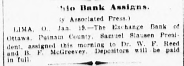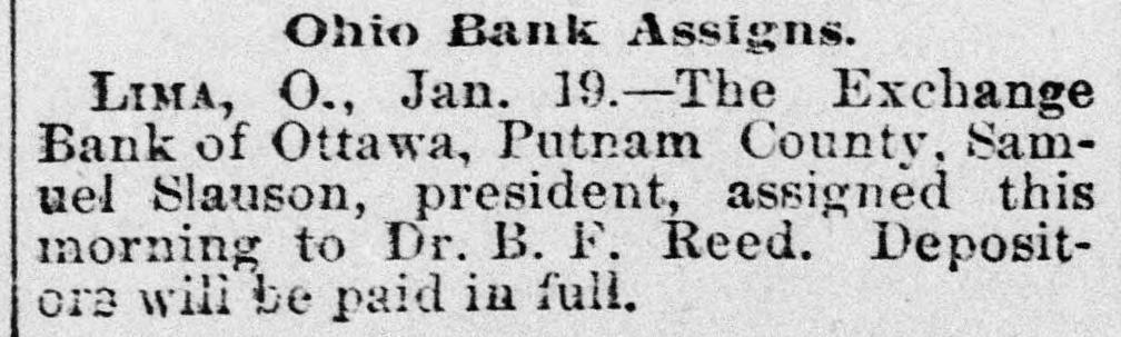 Ohio Bank Assigns. LIMA, O., Jan. 19.-The Exchange Bank of Ottawa, Putnam County, Samuel Slauson, president, assigned this morning to Dr. B. F. Reed. Depositore will be paid in full.