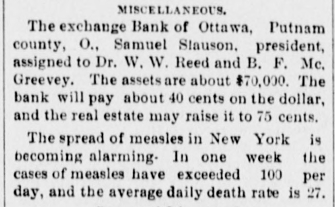 MISCELLANEOUS. The exchange Bank of Ottawa, Putnam county, O., Samuel Slauson. president, assigned to Dr. W. W. Reed and B. F. Mc. Greevey. The assets are about $70,000. The bank will pay about 40 cents on the dollar, and the real estate may raise it to 75 cents. The spread of measles in New York is becoming alarming- In one week the cases of measles have exceeded 100 per day, and the average daily death rate is 27.