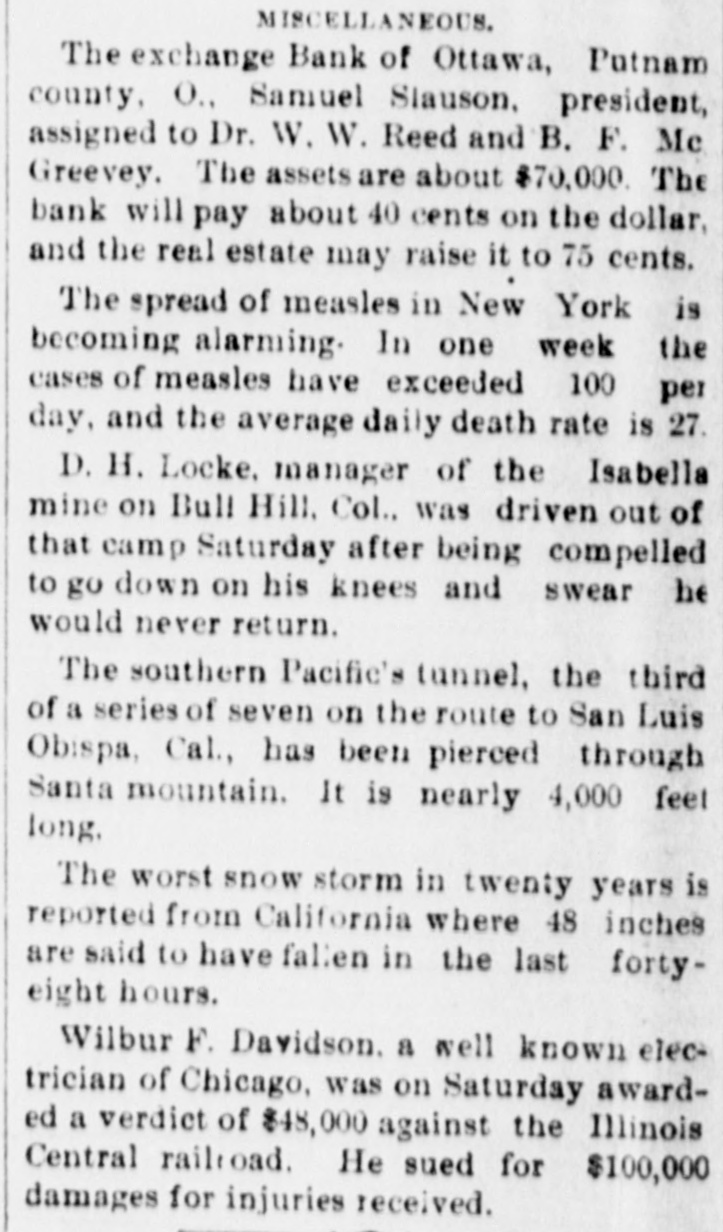 MISCELLANEOUS. The exchange Bank of Ottawa, Putnam county, O., Samuel Slauson, president, assigned to Dr. W. W. Reed and B. F. Mc Greevey. The assets are about $70,000. The bank will pay about 40 cents on the dollar, and the real estate may raise it to 75 cents. The spread of measles in New York is becoming alarming. In one week the cases of measles have exceeded 100 per day, and the average daily death rate is 27. D. H. Locke, manager of the Isabella mine on Bull Hill, Col., was driven out of that camp Saturday after being compelled to go down on his knees and swear he would never return. The southern Pacific's tunnel, the third of a series of seven on the route to San Luis Obispa, Cal., has been pierced through Santa mountain. It is nearly 4,000 feet long, The worst snow storm in twenty years is reported from California where 48 inches are said to have fallen in the last fortyeight hours. Wilbur F. Davidson. a well known electrician of Chicago, was on Saturday awarded a verdict of $48,000 against the Illinois Central railroad. He sued for $100,000 damages for injuries received.