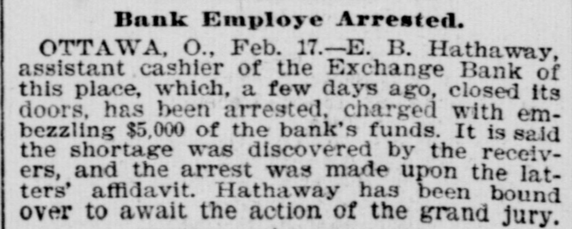 Bank Employe Arrested. OTTAWA, O., Feb. 17.-E. B. Hathaway, assistant cashier of the Exchange Bank of this place, which, a few days ago, closed its doors, has been arrested, charged with embezzling $5,000 of the bank's funds. It is said the shortage was discovered by the receivers, and the arrest was made upon the latters' affidavit. Hathaway has been bound over to await the action of the grand jury.