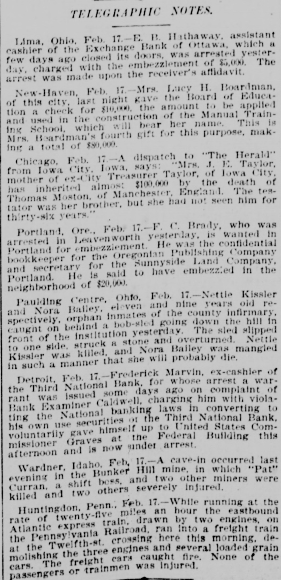 TELEGRAPHIC NOTES. Lima, Ohio, Feb. 17.-E. B. Hathaway, assistant cashier of the Exchange Bank of Ottawa, which a few days ago closed its doors, was arrested yesterday, charged with the embezzlement of $5,000. The arrest was made upon the receiver's affidavit. New-Haven, Feb. 17.Mrs. Lucy H. Boardman, of this city, last night gave the Board of Education a check for $10,000. the amount to be applied and used in the construction of the Manual Training School, which will bear her name. This is Mrs. Boardman's fourth gift for this purpose, making a total of $80,000. Chicago, Feb. 17.-A dispatch to "The Herald" from Iowa City, Iowa, says: "Mrs. J. E. Taylor, mother of ex-City Treasurer Taylor, of Iowa City, has inherited almost $100,000 by the death of Thomas Moston, of Manchester, England. The testator was her brother, but she had not seen him for thirty-six years." Portland, Ore., Feb. 17.-F. C. Brady, who was arrested in Leavenworth yesterday, is wanted in Portland for embezziement. He was the confidential bookkeeper for the Oregontan Publishing Company and secretary for the Sunnyside Land Company, Portland. He is said to have embezzled in the neighborhood of $20,000. Paulding Centre, Ohio, Feb. Nettle Kissler and Nora Balley, eleven and nine years old respectively, orphan inmates of the county infirmary, caught on behind a bob-sted going down the hill in front of the institution yesterday. The sled slipped to one side. struck a stone and overturned. Nettle Kissler was killed. and Nora Balley was mangled in such a manner that she will probably die. Detroit, Feb. 17.-Frederick Marvin, ex-cashier of Third National Bank, for whose arrest a warthe rant was issued some days ago on complaint of Bank Examiner Caldwell, charging him with violating the National banking laws in converting to his own use securities of the Third National Bank, voluntarily gave himself up to United States Commissioner Graves at the Federal Building this afternoon and is now under arrest. Wardner, Idaho. Feb. 17.-A cave-in occurred last evening in the Bunker Hill mine, in which "Pat" Curran. a shift boss. and two other miners were killed and two others severely injured. Huntingdon, Penn., Feb. 17.-While running at the of twenty-five miles an hour the eastbound rate Atlantic express train. drawn by two engines, on the Pennsylvania Railroad, ran into a freight train the Tweifth-st. crossing here this morning, demolishing at the three engines and several loaded grain The freight cars caught fire. None of the cars. passengers or trainmen was Injured.