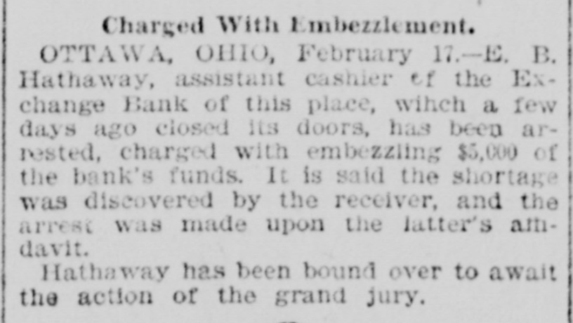 Charged With Embezzlement. OTTAWA, OHIO, February 17.-E. B. Hathaway, assistant cashier ef the Exchange Bank of this place, wihch a few days ago closed its doors, has been arrested, charged with embezzling $5,000 of the bank's funds. It is said the shortage was discovered by the receiver, and the arrest was made upon the latter's amdavit. Hathaway has been bound over to await the action of the grand jury.