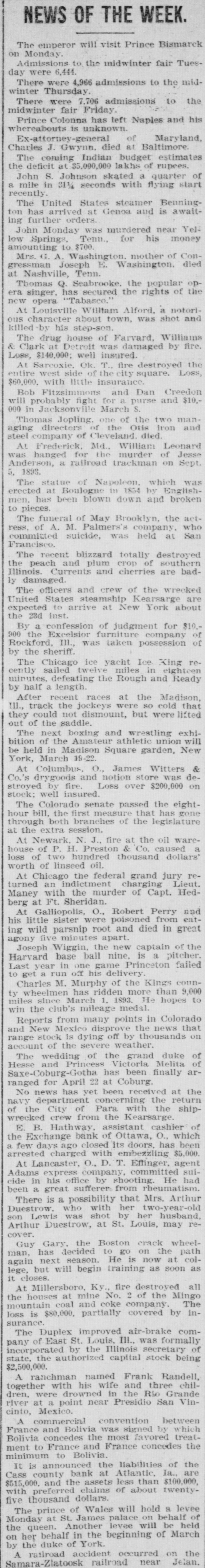 NEWS OF THE WEEK. The emperor will visit Prince Bismarck on Monday. Admissions to the midwinter fair Tuesday were 6,444. There were 4,966 admissions to the midwinter Thursday. There were 7.706 admissions to the midwinter fair Friday. Prince Colonna has left Naples and his whereabouts is unknown. Ex-attorney-general of Maryland, Charles J. Gwynn, died at Baltimore. The coming Indian budget estimates the deficit at $5,000,000 lakhs of rupees. John S. Johnson skated a quarter of a mile in 31% seconds with flying start recently. The United States steamer Bennington has arrived at Genoa and is awaiting further orders. John Monday was murdered near Yellow Springs, Tenn., for his money amounting to $700. Mrs. G. A. Washington. mother of Congressman Joseph E. Washington, died at Nashville, Tenn. Thomas Q. Seabrooke. the popular opera singer, has secured the rights of the new opera "Tabasco." At Louisville William Alford, a notorious character about town, was shot and killed by his step-son. The drug house of Farvard, Williams & Clark at Detroit was damaged by fire. Loss, $140,000; well insured. At Sarcoxie, Ok. T., fire destroyed the entire west side of the city square. Loss, $60,000. with little insurance. Bob Fitzsimmons and Dan Creedon will probably fight for a purse and $10,000 in Jacksonville March 8. Thomas Jopling. one of the two managing directors of the Otis iron and steel company of Cleveland. died. At Frederick, Md., William Leonard was hanged for the murder of Jesse Anderson, a railroad trackman on Sept. 5, 1893. The statue of Napoleon, which was erected at Boulogne in 1854 by Englishmen. has been blown down and broken to pieces. The funeral of May Brooklyn, the actress, of A. M. Palmers's company, who committed suicide, was held at San Francisco. The recent blizzard totally destroyed the peach and plum crop of southern Illinois. Currents and cherries are badly damaged. The officers and crew of the wrecked United States steamship Kearsarge are expected to arrive at New York about the 23d inst. By a confession of judgment for $10.900 the Excelsior furniture company of Rockford. III., was taken possession of by the sheriff. The Chicago ice yacht Ice King recently sailed twelve miles in eighteen minutes, defeating the Rough and Ready by half a length. After recent races at the Madison, III., track the jockeys were so cold that they could not dismount, but were lifted out of the saddle. The next boxing and wrestling exhibition of the Amateur athletic union will be held in Madison Square garden, New York, March 19-22. At Columbus, O., James Witters & Co.'s drygoods and notion store was destroyed by fire. Loss over $200,000 on stock; well insured. The Colorado senate passed the eighthour bill, the first measure that has gone through both branches of the legislature at the extra session. At Newark. N. J., fire at the oil warehouse of P. H. Preston & Co. caused a loss of two hundred thousand dollars' worth of linseed oil. At Chicago the federal grand jury returned an indictment charging Lieut. Maney with the murder of Capt. Hedberg at Ft. Sheridan. At Galliopolis, O., Robert Perry and his little sister were poisoned from eating wild parsnip root and died in great agony five minutes apart. Joseph Wiggin, the new captain of the Harvard base ball nine. is a pitcher. Last year in one game Princeton failed to get a run off his delivery. Charles M. Murphy of the Kings county wheelmen has ridden more than 9,000 miles since March 1, 1893. He hopes to win the club's mileage medal. Reports from many points in Colorado and New Mexico disprove the news that range stock is dying off by thousands on account of the severe weather. The wedding of the grand duke of Hesse and Princess Victoria Melita of Saxe-Coburg-Gotha has been finally arranged for April 22 at Coburg. No news has yet been received at the navy department concerning the return of the City of Para with the shipwrecked crew from the Kearsarge. E. B. Hathway, assistant cashier of the Exchange bank of Ottawa, O., which a few days ago closed its doors. has been arrested charged with embezzling $5,000. At Lancaster, O., D. T. Effinger, agent Adams express company, committed suicide in his office by shooting. He had been a great sufferer from rheumatism. There is a possibility that Mrs. Arthur Duestrow. who with her two-year-old son Lewis was shot by her husband, Arthur Duestrow, at St. Louis, may recover. Guy Gary, the Boston crack wheelman, has decided to go on the path again next season. He is now at college, but will begin training as soon as it closes. At Millersboro, Ky. fire destroyed all the houses at mine No. 2 of the Mingo mountain coal and coke company. The loss is $80,000, partially covered by insurance. The Duplex improved air-brake company of East St. Louis, III., was formally incorporated by the Illinois secretary of state. the authorized capital stock being $2,500,000. A ranchman named Frank Randell, together with his wife and three children, were drowned in the Rio Grande river at a point near Presidio San Vincinto, Mexico. A commercial convention between France and Bolivia was signed by which Bolivia concedes the most favored treatment to France and France concedes the minimum to Bolivia It is announced the liabilities of the Cass county bank at Atlantic. Ia., are