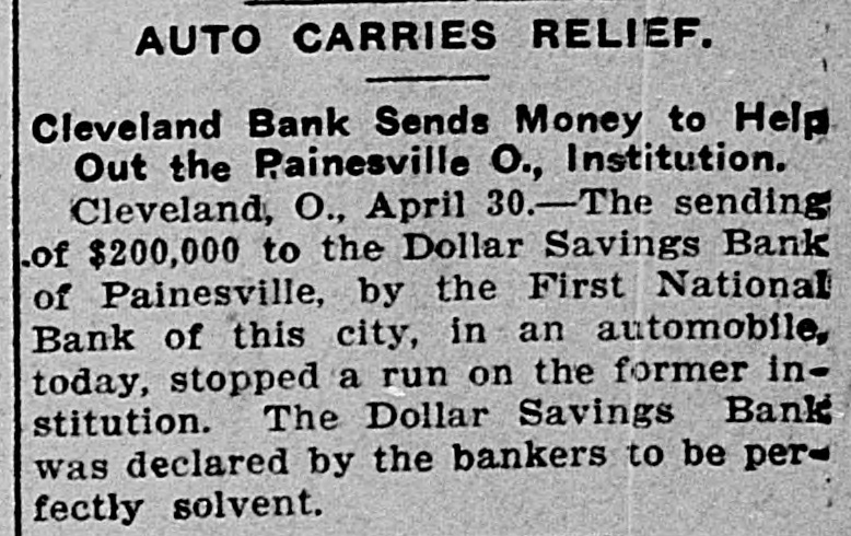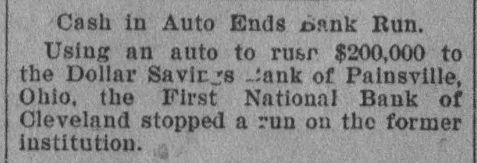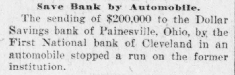Save Bank by Automobile. The sending of $200,000 to the Dollar Savings bank of Painesville, Ohio, by the First National bank of Cleveland in an automobile stopped a run on the former institution.