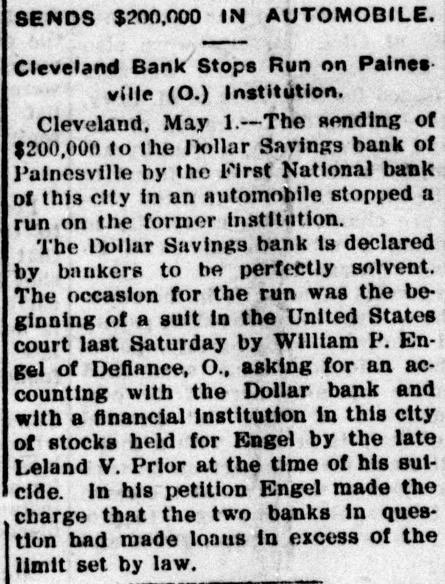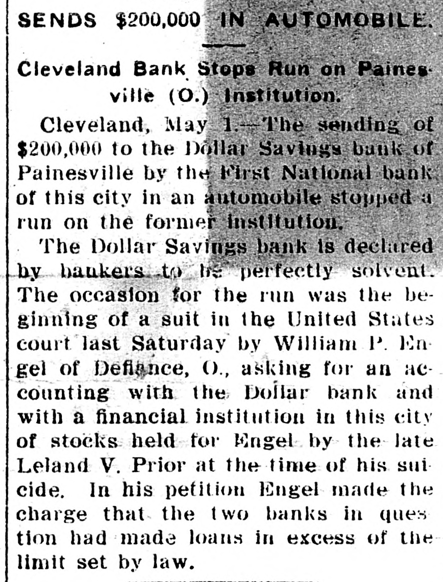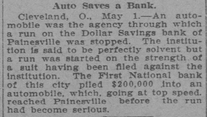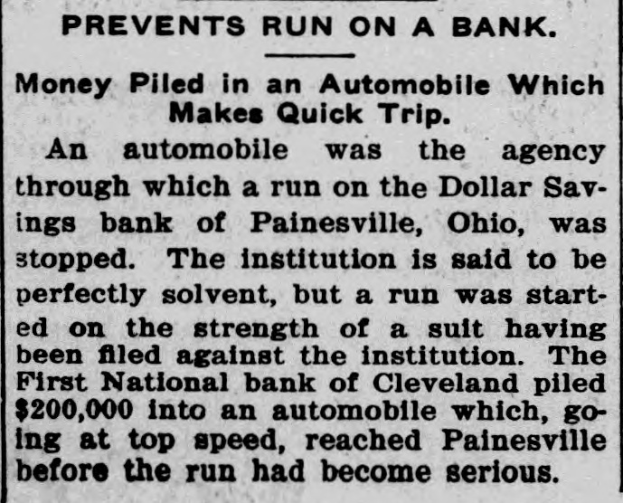 PREVENTS RUN ON A BANK. Money Piled in an Automobile Which Makes Quick Trip. An automobile was the agency through which a run on the Dollar Savings bank of Painesville, Ohio, was stopped. The institution is said to be perfectly solvent, but a run was started on the strength of a suit having been filed against the institution. The First National bank of Cleveland piled $200,000 into an automobile which, going at top speed, reached Painesville before the run had become serious.