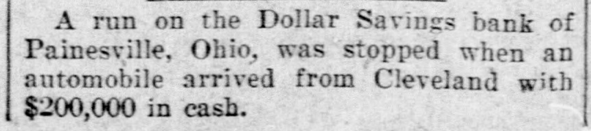 A run on the Dollar Savings bank of Painesville, Ohio, was stopped when an automobile arrived from Cleveland with $200,000 in cash.