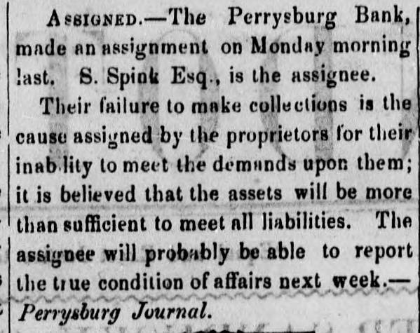 ASSIGNED.-The Perrysburg Bank, made an assignment on Monday morning last. S. Spink Esq., is the assignee. Their failure to make collections is the cause assigned by the proprietors for their inability to meet the demands upon them; it is believed that the assets will be more than sufficient to meet all liabilities. The assignee will probably be able to report the true condition of affairs next week.Perrysburg Journal.