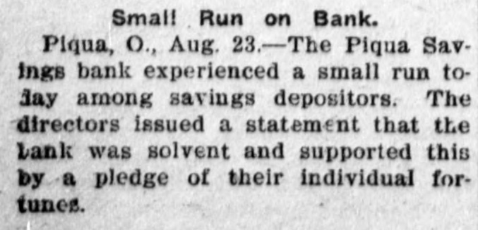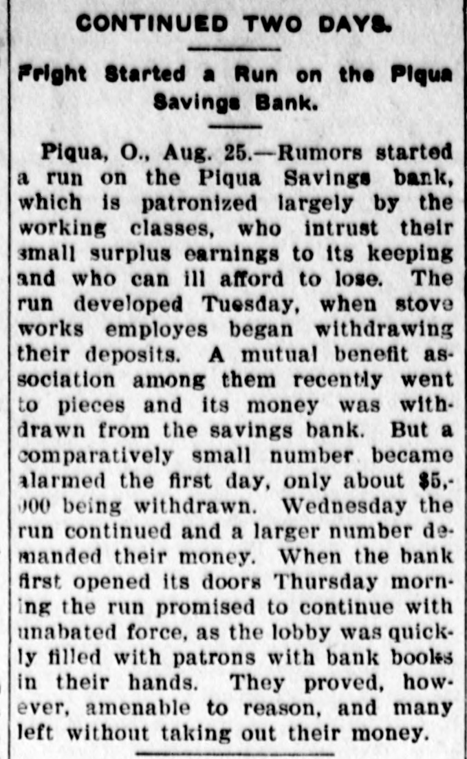 CONTINUED TWO DAYS. Fright Started a Run on the Piqua Savings Bank. Piqua, O., Aug. 25.-Rumors started a run on the Piqua Savings bank, which is patronized largely by the working classes, who intrust their small surplus earnings to its keeping and who can ill afford to lose. The run developed Tuesday, when stove works employes began withdrawing their deposits. A mutual benefit association among them recently went to pieces and its money was withdrawn from the savings bank. But a comparatively small number became alarmed the first day, only about $5,000 being withdrawn. Wednesday the run continued and a larger number demanded their money. When the bank first opened its doors Thursday morning the run promised to continue with unabated force, as the lobby was quickly filled with patrons with bank books in their hands. They proved, however, amenable to reason, and many left without taking out their money.