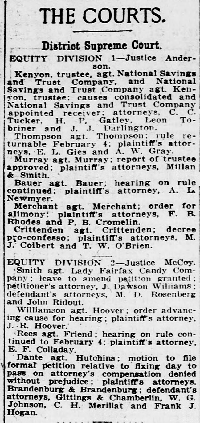 ASKS PERMIT TO SELL $100,000 IN SECURITIES National Savings and Trust Suit Outgrowth of Lewis Johnson & Co. Failure. The National Savings and Trust Company has filed in the District Supreme Court a suit for authority to sell securities valued at $100,000 held by the corporation as collateral for money advanced to the brokerage firm of Lewis Johnson & Co. As to certain of other securities now held by it to which specific claims have been made the company asks that a receiver be appointed to collect dividends pending a decision of the court as to the real ownership. Named as defendants in the suit are J. Miller Kenyon, Byron U. Graham and H. Rozier Dulany, trustees in bankruptcy of Lewis Johnson & Co., and twenty-four other alleged claimants of interests in the securities. The company declares it made certain advances to the brokerage firm on the faith of the securities and had no reason to doubt that the stocks and bonds offered as collateral were owned by Lewis Johnson & Co. It asks that it be allowed to sell some of the securities and after reimbursing itself for the loans to distribute the surplus under direction of the court. The suit is said to be similar in purpose to the one brought by the trustees in bankruptcy a few weeks ago against the trust company and the claimants of interest in the securities. It is expected that the two suits will be consolidated for hearing. Attorney J. J. Darlington appears for the trust company.