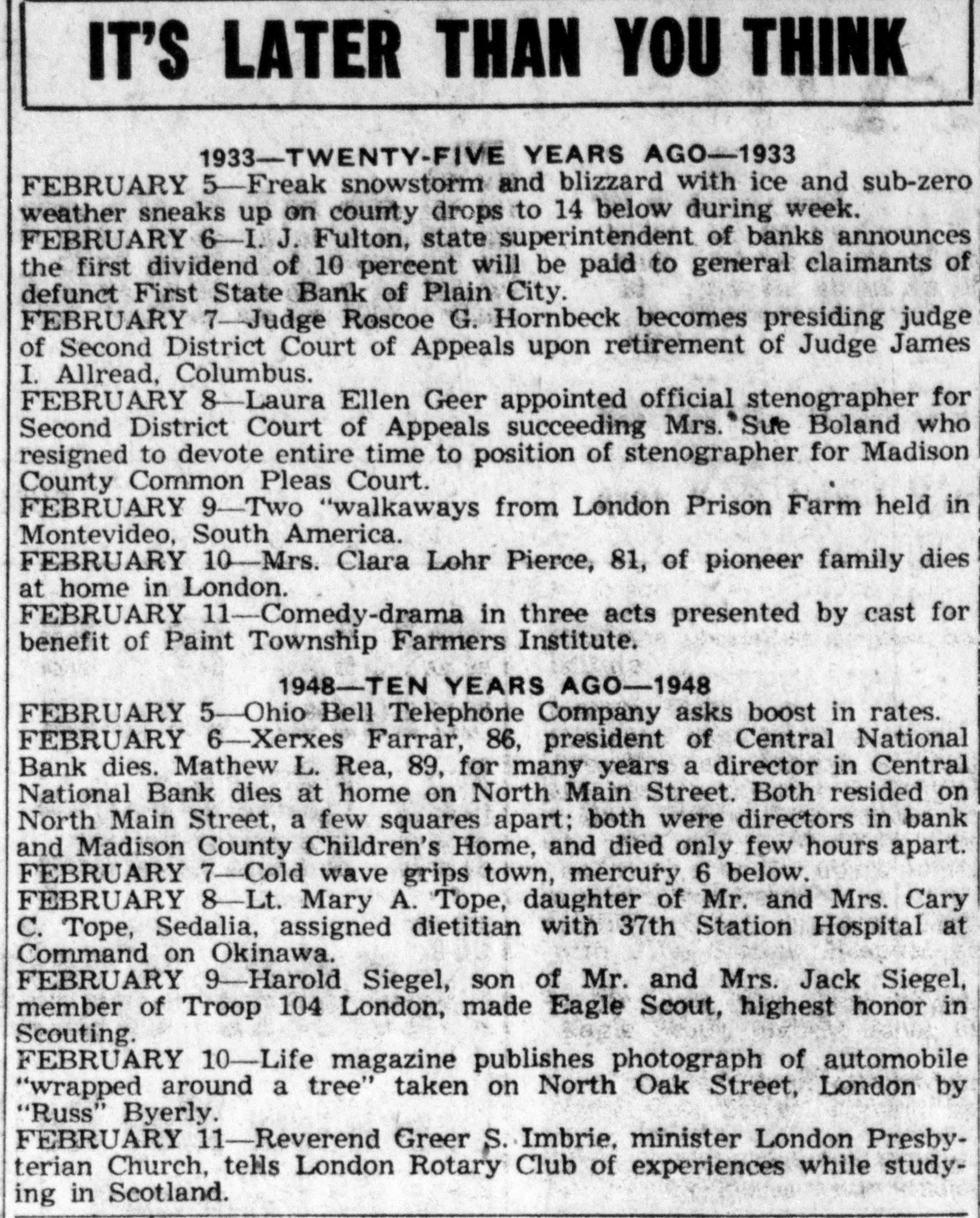 IT'S LATER THAN YOU THINK 1933-TWENTY-FIVE YEARS AGO-1933 FEBRUARY 5-Freak snowstorm and blizzard with ice and sub-zero weather sneaks up on county drops to 14 below during week. FEBRUARY 6-1. J. Fulton, state superintendent of banks announces the first dividend of 10 percent will be paid to general claimants of defunct First State Bank of Plain City. FEBRUARY 7-Judge Roscoe G. Hornbeck becomes presiding judge of Second District Court of Appeals upon retirement of Judge James I. Allread, Columbus. FEBRUARY 8-Laura Ellen Geer appointed official stenographer for Second District Court of Appeals succeeding Mrs. Sue Boland who resigned to devote entire time to position of stenographer for Madison County Common Pleas Court. FEBRUARY 9-Two "walkaways from London Prison Farm held in Montevideo, South America. FEBRUARY 10-Mrs. Clara Lohr Pierce, 81, of pioneer family dies at home in London. FEBRUARY 11-Comedy-drama in three acts presented by cast for benefit of Paint Township Farmers Institute. 1948-TEN YEARS AGO-1948 FEBRUARY 5-Ohio Bell Telephone Company asks boost in rates. FEBRUARY 6-Xerxes Farrar, 86, president of Central National Bank dies. Mathew L. Rea, 89, for many years a director in Central National Bank dies at home on North Main Street. Both resided on North Main Street, a few squares apart; both were directors in bank and Madison County Children's Home, and died only few hours apart. FEBRUARY 7-Cold wave grips town, mercury 6 below. FEBRUARY 8-Lt. Mary A. Tope, daughter of Mr. and Mrs. Cary C. Tope, Sedalia, assigned dietitian with 37th Station Hospital at Command on Okinawa. FEBRUARY 9-Harold Siegel, son of Mr. and Mrs. Jack Siegel, member of Troop 104 London, made Eagle Scout, highest honor in Scouting. FEBRUARY 10-Life magazine publishes photograph of automobile "wrapped around a tree" taken on North Oak Street, London by "Russ" Byerly. FEBRUARY 11-Reverend Greer S. Imbrie, minister London Presbyterian Church, tells London Rotary Club of experiences while studying in Scotland.