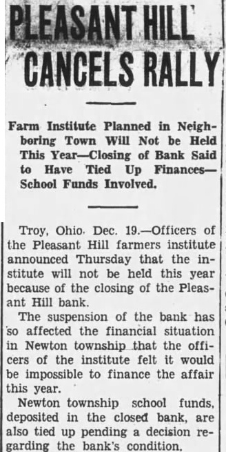 Troy, Ohio. Dec. the Pleasant Hill farmers institute announced Thursday that the institute will not be held this year because of the closing of the Pleasant Hill bank. The suspension of the bank has affected the financial situation Newton township that the offiof the institute felt would be impossible to finance the affair this year. Newton township school funds. deposited in the closed bank, are also tied up pending decision garding the bank's condition.