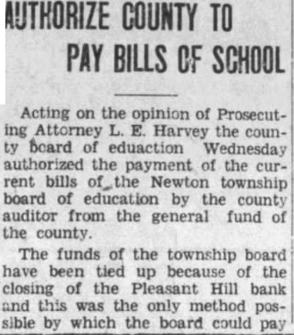 Acting on the opinion of Prosecuting Attorney L. E. Harvey the county board of eduaction Wednesday authorized the payment of the current bills the Newton township board of education by the county auditor from the general fund of the county. The funds of the township board have been tied up because of the closing of the Pleasant Hill bank and this was the only method possible by which the board could pay