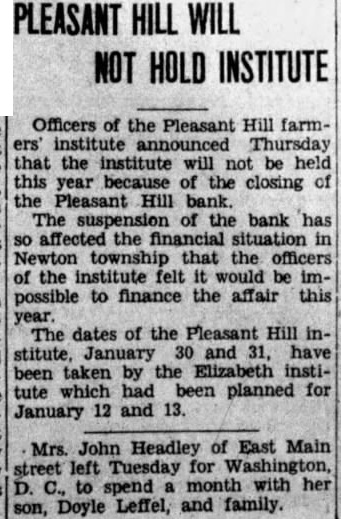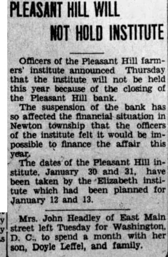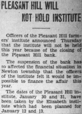 Officers of the Pleasant Hill farminstitute announced Thursday that the institute will be held this year because the closing Pleasant Hill bank. The suspension of bank has affected the financial situation in Newton township that the officers the institute felt would be possible to finance the affair this The dates of the Pleasant Hill stitute, January and have been taken the Elizabeth institute which had been planned for January 12 and