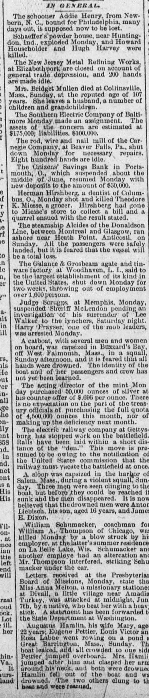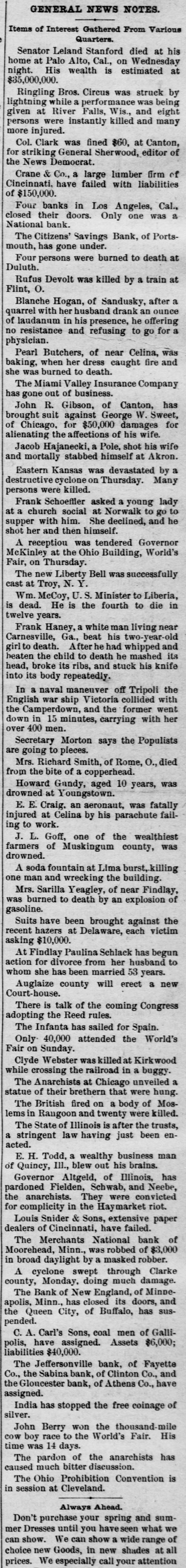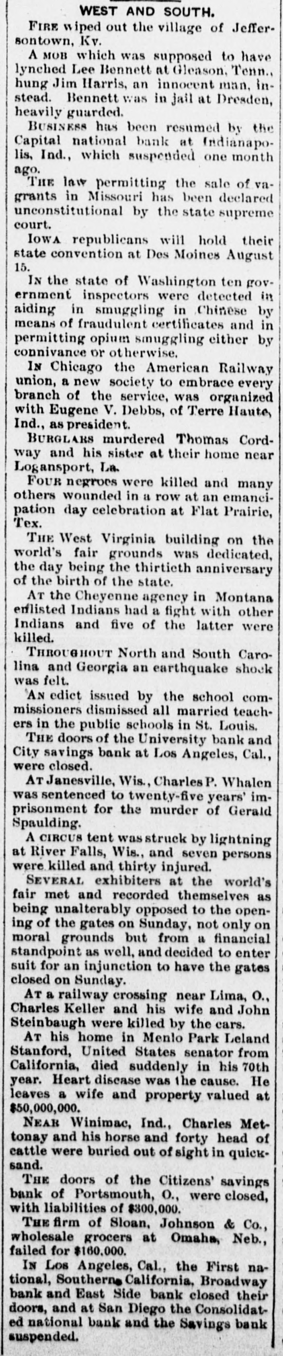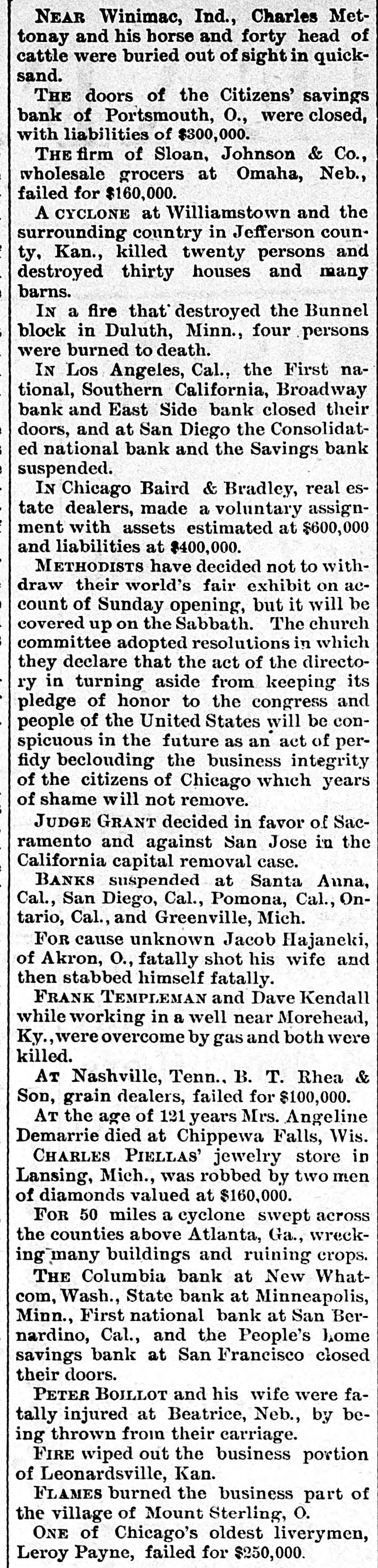 THE NEWS. A Chinese laundryman was murdered and eremated by his rival in Brainard, Minn. Mrs. Angelina de Marrie died at Chippewa in her was one hundred and seven Falls, showing Wis. that She she had proof possession years old, and Thomas Randall, in his history of the Chippewa Valley, claims that she was one hundred and twenty-one years old. Kaukauni F.ber was fire. Loss $30, The 000.-A.G. Company plant of the destroyed by (Wis.) Biker, editor of the Bremen, Ind., Standard, was whipped by Mrs. Cal. Sinninger, wife of the editor of the Euquirer. was by north of in whitecaps -Wiiliam four Buckley, miles assassinated Columbia, while on his homo he was a witness against some Marion county from court, of the murderous where Miss., whitecap gang. way Ho that he F. of the Plankinhad T. Bank been Day, warned in formerly president would be killed. ton Milwaukee, mysteriously disappeared.- E. J. Centes' dry goods store in Albany, Texas, was destroyed by firo. Loss $75,000. -Miss Alby Graffam, age. seventy years, fell asleep in her chair at her home in Auturn, Me. By some movement, a lamp close by was overturned, the old lady's clothes caught fire and she was burned to a New death. four years ---Isaac old, committed Lloyd, Welshman, suici in fiftyYork by shooting himself in his shoeshop. Before he fired the fatal shot he made his . will in the presence of a witness, one of his workmen. The American Loan and Trust Bank was appointed receiver for the General EngineerIll. Isaac Held,a dry of ing goods Company dealer of Harvey, Richmond, assigned James the from an Liabilities dynamiter, recently $10,000. discharged Gi bert, Engin New York the name on the steamer l'sh second prison, Chester, arr.ved His appears on cabin passenger list as James Cunwas met at the by Mr. and a of whoimningham. Kennedy He party friends, quarantine mediately transferred him to a Chovet was arrested on the charge of silk Superintendent in New York Anthony snugg tugboat. ing Ford, Jr. of New the while looms.---Daniel steep, walked through fourth-story York, window and was killed The boiler of the Works the superintendent and Ridgewood ploded, killing (N.J.) Stone-crush'ng exbusiness of the ing others. The portoin injurtown of Tiliamok; Ore., was burned Several was and is work of supposed Fires to started be the simultaneously, incendiarie it The total loss is $100,000 insurance half. has President Prof. E. of B. Clemen Craighead College, been Columbia, elected C. This is the new agricultural opened Jul, 1st. which will be Craighead college considered one of the finest educators the Pacific Bank of Francisco one South.----The closed its doors. Fuly San hundred of me in the employ of Campbell & section struck La that their fo eight mont. of Ill. the They drainage claim canal, Co., on wages in g past not been them e The strikers two months have paid are behaving quietly, but de clare before the g a return and three they to work -Twelve will have their money business house dwell'ng houses in a one-th'rd of the was S Ky., by about fire. Loss, town, Leonardsvil wipe out $30,000 parti .Ily insured to bone t water works a the Those town who for defeated $5,000 for the proposition yea ago were th only ones who lost fire a in g cha'n -Caleb Wright, neg:0 preacher in the th gang, committed suicide by jumpin e ne... Ga. He sen and ha d into tenced the for liver wife-beating, Rome, pretche was is to the convicts several times. It is believe he committed suicide on acc. unt of learnin a of his wife's faithlessness. Union Pacifi h ste mer which leit Port of large and land, Oregon, R. R. with Th mpson, frieght passen ger list, struck a snag, filled with water an went to the bottom. Is Senator Leland Stanford died at his home e in Palo Altd. --Francis Spies, vice consi g of Honduras, killed himself in New York. I At Williamsport, Pa., fire destroyed th saw mill of Payne, Cockran & Co. One , the boilers blew up, but no person was hur y at about is bein dThe B'shop loss Bonacum, is estimated of Lincoln, Neb. $85,000. tried by Mgr. Satolli for alleged mal leasan in office. Madison, Wis., the home L. Vandusen was destroyed by fire, one chil was nt so burne domestic, cremated, Theresa another Rink, badly burned, badly and g that she is not expected to live. The fire was m caused by the explosion of kerosene -Lew st Dreyfus, a wealthy business man, of Lor nBranch, blew out his brains, David Ke es dall and Frank Templeman were overco: by gas while working in a well, near Mor ehead, Ky., and killed. Dr. John Hood, r', Aden, Tenn. killed Wm. Piper, his wife cpar.mour, a Southern California islimp at him. by throwing The burning coal National Bank and the Los Angeles Nat on cBank of Los Angeles, Cal., suspended. on The Citizens' Savings Bank of Portsmout an ag In 8 tra of 000 O., made assets $400,000. assignment. Liabilities freight $300 wreck near Prospect, O., on the Hocki cal Valley Railroad, three men were killed a he a number injured.