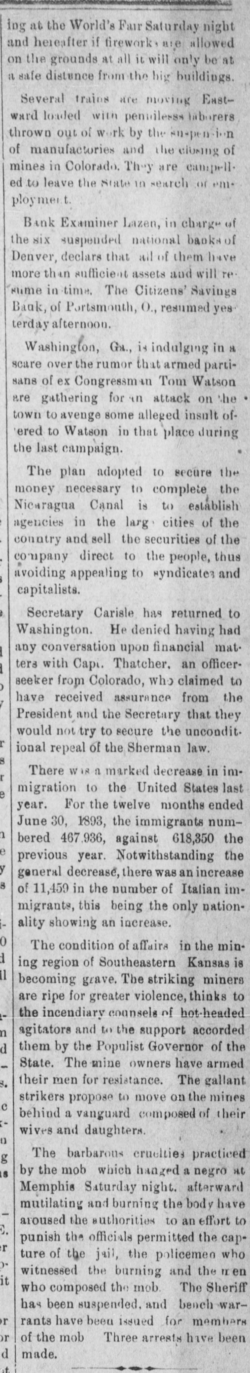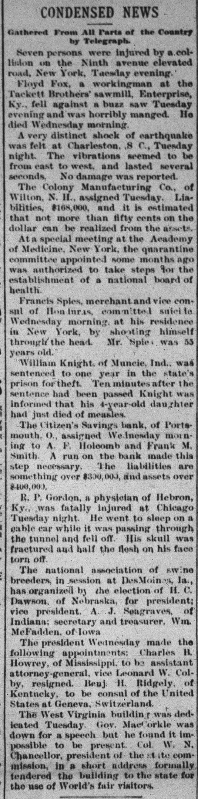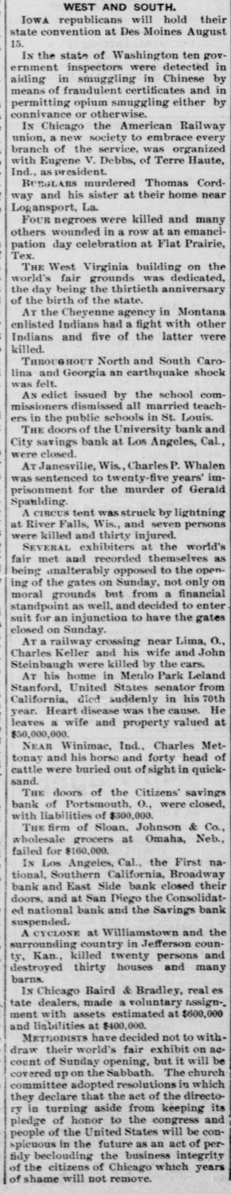 THE NEWS. A Chinese laundryman was murdered and eremated by his rival in Brainard, Minn. Mrs. Angelina de Marrie died at Chippewa in her was one hundred and seven Falls, showing Wis. that She she had proof possession years old, and Thomas Randall, in his history of the Chippewa Valley, claims that she was one hundred and twenty-one years old. Kaukauni F.ber was fire. Loss $30, The 000.-A.G. Company plant of the destroyed by (Wis.) Biker, editor of the Bremen, Ind., Standard, was whipped by Mrs. Cal. Sinninger, wife of the editor of the Euquirer. was by north of in whitecaps -Wiiliam four Buckley, miles assassinated Columbia, while on his homo he was a witness against some Marion county from court, of the murderous where Miss., whitecap gang. way Ho that he F. of the Plankinhad T. Bank been Day, warned in formerly president would be killed. ton Milwaukee, mysteriously disappeared.- E. J. Centes' dry goods store in Albany, Texas, was destroyed by firo. Loss $75,000. -Miss Alby Graffam, age. seventy years, fell asleep in her chair at her home in Auturn, Me. By some movement, a lamp close by was overturned, the old lady's clothes caught fire and she was burned to a New death. four years ---Isaac old, committed Lloyd, Welshman, suici in fiftyYork by shooting himself in his shoeshop. Before he fired the fatal shot he made his . will in the presence of a witness, one of his workmen. The American Loan and Trust Bank was appointed receiver for the General EngineerIll. Isaac Held,a dry of ing goods Company dealer of Harvey, Richmond, assigned James the from an Liabilities dynamiter, recently $10,000. discharged Gi bert, Engin New York the name on the steamer l'sh second prison, Chester, arr.ved His appears on cabin passenger list as James Cunwas met at the by Mr. and a of whoimningham. Kennedy He party friends, quarantine mediately transferred him to a Chovet was arrested on the charge of silk Superintendent in New York Anthony snugg tugboat. ing Ford, Jr. of New the while looms.---Daniel steep, walked through fourth-story York, window and was killed The boiler of the Works the superintendent and Ridgewood ploded, killing (N.J.) Stone-crush'ng exbusiness of the ing others. The portoin injurtown of Tiliamok; Ore., was burned Several was and is work of supposed Fires to started be the simultaneously, incendiarie it The total loss is $100,000 insurance half. has President Prof. E. of B. Clemen Craighead College, been Columbia, elected C. This is the new agricultural opened Jul, 1st. which will be Craighead college considered one of the finest educators the Pacific Bank of Francisco one South.----The closed its doors. Fuly San hundred of me in the employ of Campbell & section struck La that their fo eight mont. of Ill. the They drainage claim canal, Co., on wages in g past not been them e The strikers two months have paid are behaving quietly, but de clare before the g a return and three they to work -Twelve will have their money business house dwell'ng houses in a one-th'rd of the was S Ky., by about fire. Loss, town, Leonardsvil wipe out $30,000 parti .Ily insured to bone t water works a the Those town who for defeated $5,000 for the proposition yea ago were th only ones who lost fire a in g cha'n -Caleb Wright, neg:0 preacher in the th gang, committed suicide by jumpin e ne... Ga. He sen and ha d into tenced the for liver wife-beating, Rome, pretche was is to the convicts several times. It is believe he committed suicide on acc. unt of learnin a of his wife's faithlessness. Union Pacifi h ste mer which leit Port of large and land, Oregon, R. R. with Th mpson, frieght passen ger list, struck a snag, filled with water an went to the bottom. Is Senator Leland Stanford died at his home e in Palo Altd. --Francis Spies, vice consi g of Honduras, killed himself in New York. I At Williamsport, Pa., fire destroyed th saw mill of Payne, Cockran & Co. One , the boilers blew up, but no person was hur y at about is bein dThe B'shop loss Bonacum, is estimated of Lincoln, Neb. $85,000. tried by Mgr. Satolli for alleged mal leasan in office. Madison, Wis., the home L. Vandusen was destroyed by fire, one chil was nt so burne domestic, cremated, Theresa another Rink, badly burned, badly and g that she is not expected to live. The fire was m caused by the explosion of kerosene -Lew st Dreyfus, a wealthy business man, of Lor nBranch, blew out his brains, David Ke es dall and Frank Templeman were overco: by gas while working in a well, near Mor ehead, Ky., and killed. Dr. John Hood, r', Aden, Tenn. killed Wm. Piper, his wife cpar.mour, a Southern California islimp at him. by throwing The burning coal National Bank and the Los Angeles Nat on cBank of Los Angeles, Cal., suspended. on The Citizens' Savings Bank of Portsmout an ag In 8 tra of 000 O., made assets $400,000. assignment. Liabilities freight $300 wreck near Prospect, O., on the Hocki cal Valley Railroad, three men were killed a he a number injured.