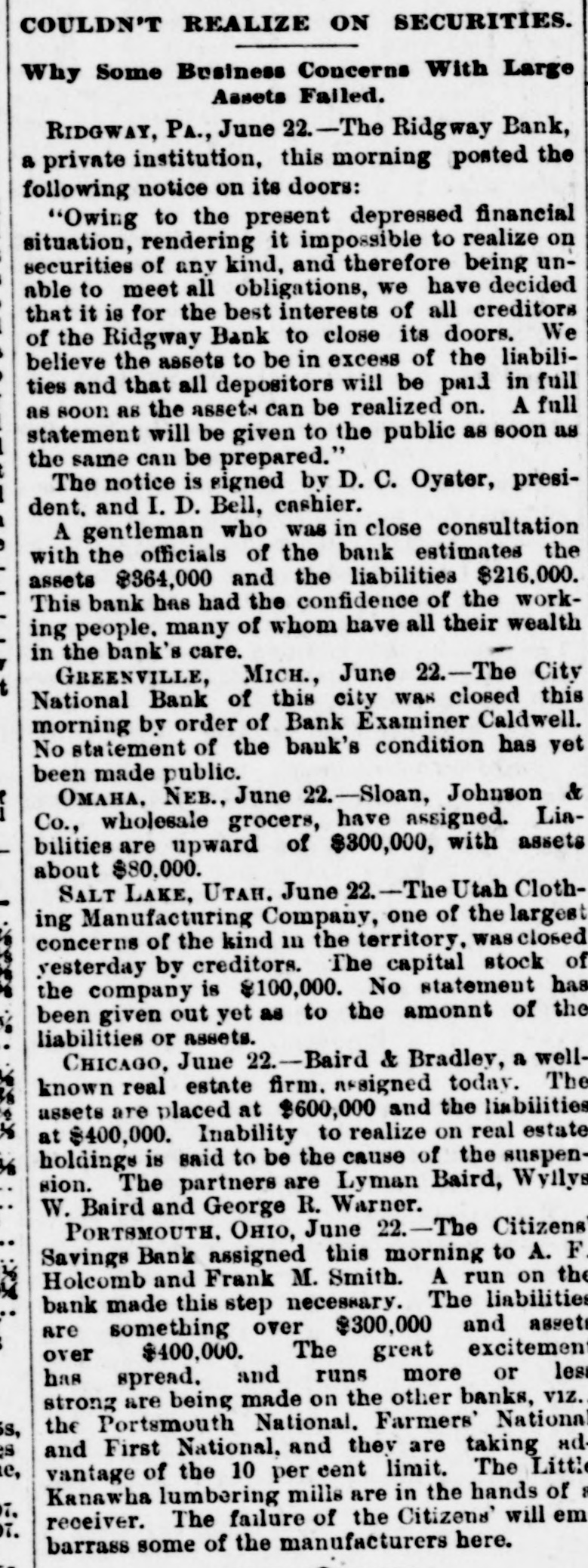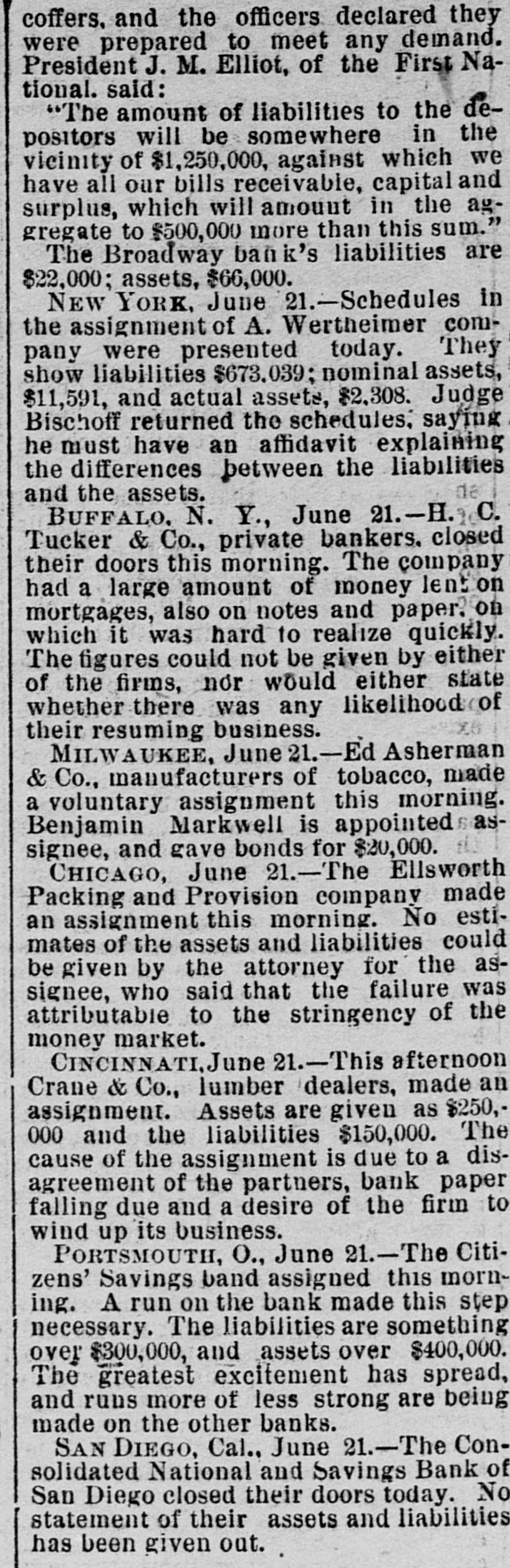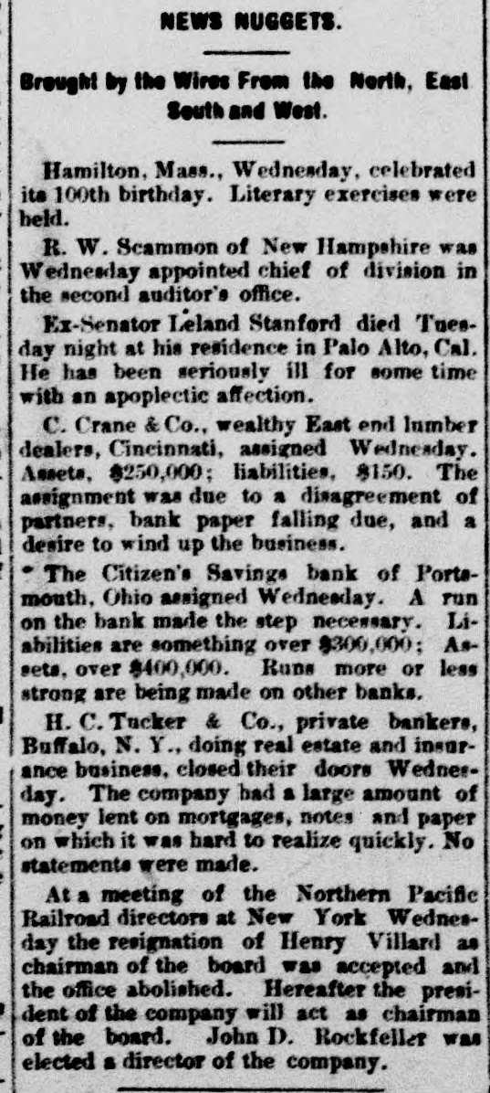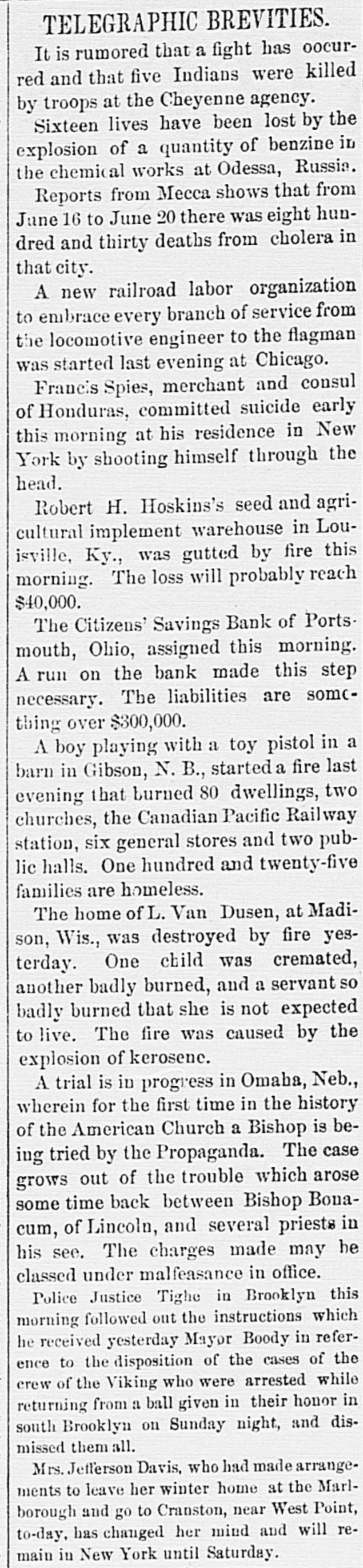THE NEWS. A Chinese laundryman was murdered and eremated by his rival in Brainard, Minn. Mrs. Angelina de Marrie died at Chippewa in her was one hundred and seven Falls, showing Wis. that She she had proof possession years old, and Thomas Randall, in his history of the Chippewa Valley, claims that she was one hundred and twenty-one years old. Kaukauni F.ber was fire. Loss $30, The 000.-A.G. Company plant of the destroyed by (Wis.) Biker, editor of the Bremen, Ind., Standard, was whipped by Mrs. Cal. Sinninger, wife of the editor of the Euquirer. was by north of in whitecaps -Wiiliam four Buckley, miles assassinated Columbia, while on his homo he was a witness against some Marion county from court, of the murderous where Miss., whitecap gang. way Ho that he F. of the Plankinhad T. Bank been Day, warned in formerly president would be killed. ton Milwaukee, mysteriously disappeared.- E. J. Centes' dry goods store in Albany, Texas, was destroyed by firo. Loss $75,000. -Miss Alby Graffam, age. seventy years, fell asleep in her chair at her home in Auturn, Me. By some movement, a lamp close by was overturned, the old lady's clothes caught fire and she was burned to a New death. four years ---Isaac old, committed Lloyd, Welshman, suici in fiftyYork by shooting himself in his shoeshop. Before he fired the fatal shot he made his . will in the presence of a witness, one of his workmen. The American Loan and Trust Bank was appointed receiver for the General EngineerIll. Isaac Held,a dry of ing goods Company dealer of Harvey, Richmond, assigned James the from an Liabilities dynamiter, recently $10,000. discharged Gi bert, Engin New York the name on the steamer l'sh second prison, Chester, arr.ved His appears on cabin passenger list as James Cunwas met at the by Mr. and a of whoimningham. Kennedy He party friends, quarantine mediately transferred him to a Chovet was arrested on the charge of silk Superintendent in New York Anthony snugg tugboat. ing Ford, Jr. of New the while looms.---Daniel steep, walked through fourth-story York, window and was killed The boiler of the Works the superintendent and Ridgewood ploded, killing (N.J.) Stone-crush'ng exbusiness of the ing others. The portoin injurtown of Tiliamok; Ore., was burned Several was and is work of supposed Fires to started be the simultaneously, incendiarie it The total loss is $100,000 insurance half. has President Prof. E. of B. Clemen Craighead College, been Columbia, elected C. This is the new agricultural opened Jul, 1st. which will be Craighead college considered one of the finest educators the Pacific Bank of Francisco one South.----The closed its doors. Fuly San hundred of me in the employ of Campbell & section struck La that their fo eight mont. of Ill. the They drainage claim canal, Co., on wages in g past not been them e The strikers two months have paid are behaving quietly, but de clare before the g a return and three they to work -Twelve will have their money business house dwell'ng houses in a one-th'rd of the was S Ky., by about fire. Loss, town, Leonardsvil wipe out $30,000 parti .Ily insured to bone t water works a the Those town who for defeated $5,000 for the proposition yea ago were th only ones who lost fire a in g cha'n -Caleb Wright, neg:0 preacher in the th gang, committed suicide by jumpin e ne... Ga. He sen and ha d into tenced the for liver wife-beating, Rome, pretche was is to the convicts several times. It is believe he committed suicide on acc. unt of learnin a of his wife's faithlessness. Union Pacifi h ste mer which leit Port of large and land, Oregon, R. R. with Th mpson, frieght passen ger list, struck a snag, filled with water an went to the bottom. Is Senator Leland Stanford died at his home e in Palo Altd. --Francis Spies, vice consi g of Honduras, killed himself in New York. I At Williamsport, Pa., fire destroyed th saw mill of Payne, Cockran & Co. One , the boilers blew up, but no person was hur y at about is bein dThe B'shop loss Bonacum, is estimated of Lincoln, Neb. $85,000. tried by Mgr. Satolli for alleged mal leasan in office. Madison, Wis., the home L. Vandusen was destroyed by fire, one chil was nt so burne domestic, cremated, Theresa another Rink, badly burned, badly and g that she is not expected to live. The fire was m caused by the explosion of kerosene -Lew st Dreyfus, a wealthy business man, of Lor nBranch, blew out his brains, David Ke es dall and Frank Templeman were overco: by gas while working in a well, near Mor ehead, Ky., and killed. Dr. John Hood, r', Aden, Tenn. killed Wm. Piper, his wife cpar.mour, a Southern California islimp at him. by throwing The burning coal National Bank and the Los Angeles Nat on cBank of Los Angeles, Cal., suspended. on The Citizens' Savings Bank of Portsmout an ag In 8 tra of 000 O., made assets $400,000. assignment. Liabilities freight $300 wreck near Prospect, O., on the Hocki cal Valley Railroad, three men were killed a he a number injured.