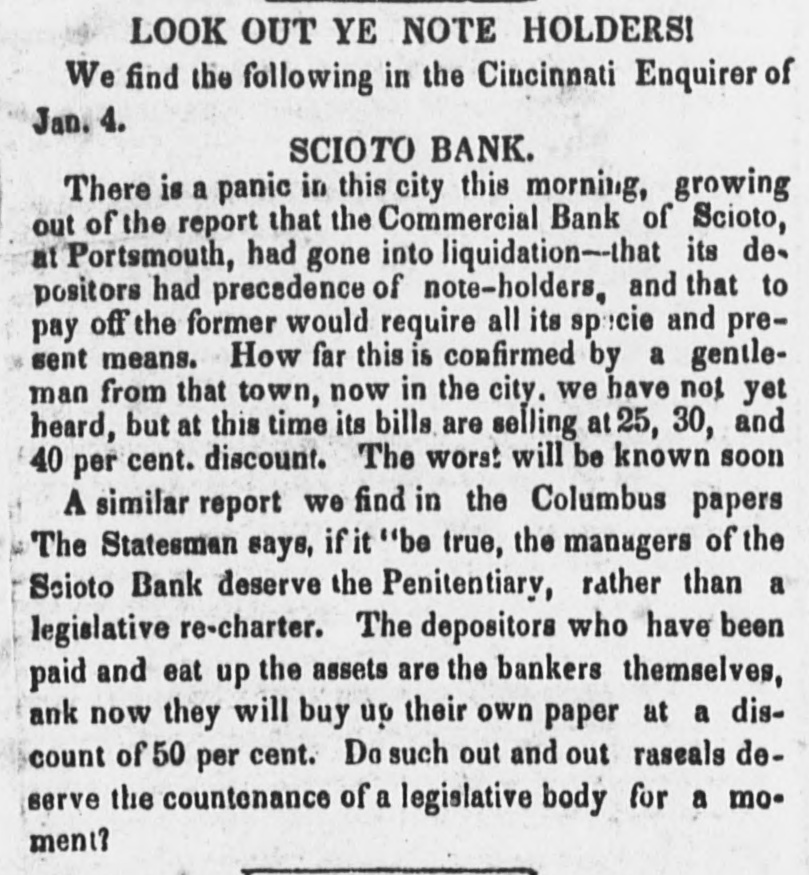 LOOK OUT YE NOTE HOLDERS! We find the following in the Cincinnati Enquirer of Jan. 4. SCIOTO BANK. There is a panic in this city this morning, growing out of the report that the Commercial Bank of Scioto, at Portsmouth, had gone into liquidation- that its depositors had precedence of note-holders, and that to pay off the former would require all its specie and present means. How far this is confirmed by a gentleman from that town, now in the city. we have not yet heard, but at this time its bills are selling at 25, 30, and 40 per cent. discount. The worst will be known soon A similar report we find in the Columbus papers The Statesman says, if it "be true, the managers of the Seioto Bank deserve the Penitentiary, rather than a legislative re-charter. The depositors who have been paid and eat up the assets are the bankers themselves, ank now they will buy up their own paper at a discount of 50 per cent. Do such out and out raseals deserve the countenance of a legislative body for a moment?