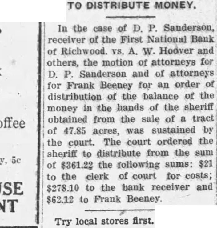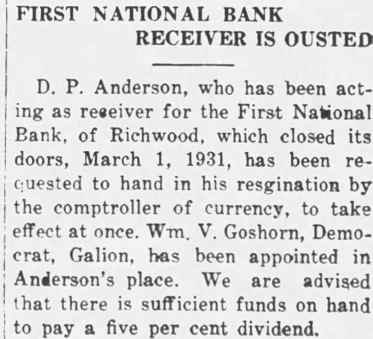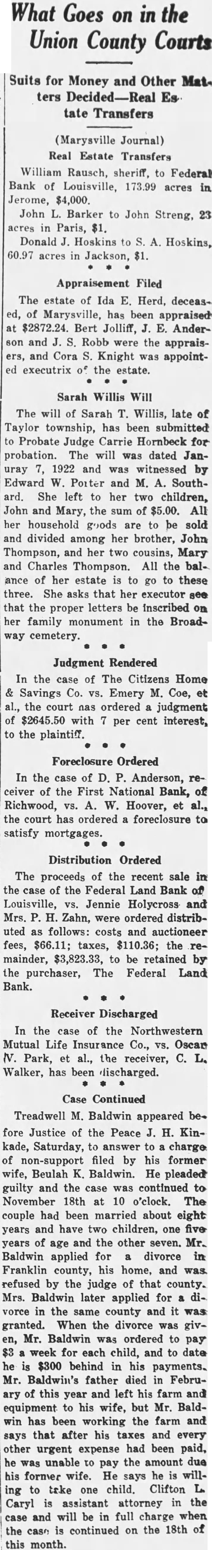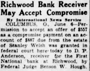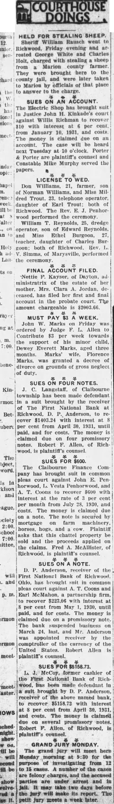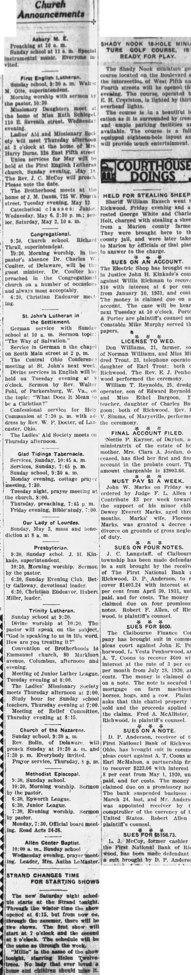 Church Announcements Asbury Preaching 10 Sunday school at instrumental music. vited. First English Lutheran. Sunday school, Otte, superintendent. Morning worship with sermon the pastor, Missionary Daughters meet home of Miss Ruth the 110 E. Seventh street, evening. Ladies' Ald and Missionary will meet Thursday afternoon ety o'clock at the home of Harry Burns. 326 East Fifth street Union services for May will at the First English Lutheran held church, Sunday evening, May McCoy will The Rev. Please note the date. The Brotherhood meets home Daum, street, Tuesday evening, May 12 Catechetical Junior May ior, Saturday, May Congregational. Church school. Richard Thrall. superintendent. Morning worship. In pastor's absence Dr. Charles Coulter, of Delaware, will be minister. Dr. Coulter guest preached in the church on number of occasions and always most acceptably. 6:30, Christian Endeavor ing. St. John's Lutheran in the Settlement. German service with Sunday school at 10 Sermon topic "The Way of Salvation. Service in German the chapel on South Main street at m. The Central Ohio Conference meeting at St. John's next week Divine services in English held on Tuesday evening at o'clock. Sermon by Rev. Walter Pohl, of Parkersburg, W. Va., the topic: "What Does It Mean be Christian?" Confessional service for Holy Communion at with dress by Rev. F. Docter, of Lancaster, Ohio. The Ladies' Aid Society meets Thursday afternoon. Glad Tidings Tabernacle. Services, Sunday, m. Services, Sunday, m. Sunday school, 9:30 m. Monday evening, cottage meeting, 7:30. Tuesday night, prayer meeting the church, 8:00. Thursday, preaching, m. Friday evening, Our Lady of Lourdes. Sunday, May 3, mass and benediction at Presbyterian. 9:30. Sunday schol. J. H. Kinkade, superintendent. Morning worship. Sermon by the pastor. 6:30, Sunday Evening Club. Betty Galloway, devotional leader. 6:30, Christian Endeavor. Hubert Miller, leader. Trinity Lutheran. Sunday school at 9:30. Divine worship at 10:30. The pastor will speak on the subject, "God is speaking to us in His word. How are you treating Convention of Brotherhoods in Emmanuel church, 80 Markison avenue, Columbus, afternoon and evening. Meeting of Junior Luther League, Tuesday evening at 8:00. The Ladies' Missionary Society meets Thursday afternoon at 2:00. Study hour for Sunday school teachers, Thursday evening at 7:00 Meeting of Relief Committee, Thursday evening at Church of the Nazarene. NOTE. Sunday school, 9:30 D. Anderson, receiver of the Rev. Bolin, Delaware will First National Bank of Richwood. preach Sunday at 10:30 m. and Ohio, has brought suit in common m. Everybody invited. pleas court against Coons and Prayer Thursday, Earl McMahon, partnership firm. Methodist Episcopal. per cent from May 1930, until Sunday school. paid, and for costs. The money is Morning worship. Sermon claimed due on promissory note. the pastor. The bank suspended business on 6:30, Epworth League. March 24. last, and Mr. Anderson 6:30, Junior League. was appointed receiver by the 7:30, Evening worship. Sermon comptroller of the currency of the pastor. United States. Robert Allen Monday, Official board meet- plaintiff's counsel. Read Acts 24-26. L. McCoy, former cashier of Allen Center Baptist. the First National Bank of Richm., Sunday school wood, has been made defendant in Wednesday evening, suit brought by D. Anderson, ing. Leader, Mrs. Autha LeMaster. STRAND CHANGES TIME FOR STARTING SHOWS The new Saturday night schedstarts at the Strand tonight. Through the winter time the show opened at 6:15, but from now on, through the summer, there will be two shows. The first show will start at o'clock and the second o'eleck. The schedule will be the same as through the week. "Millie" is the name of the show touight, starring Helen TwelveNo lady that ever loved home and children should miss