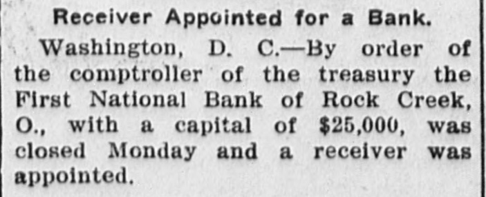 Receiver Appointed for a Bank. Washington, D. C.-By order of the comptroller of the treasury the First National Bank of Rock Creek, O., with a capital of $25,000, was closed Monday and a receiver was appointed.