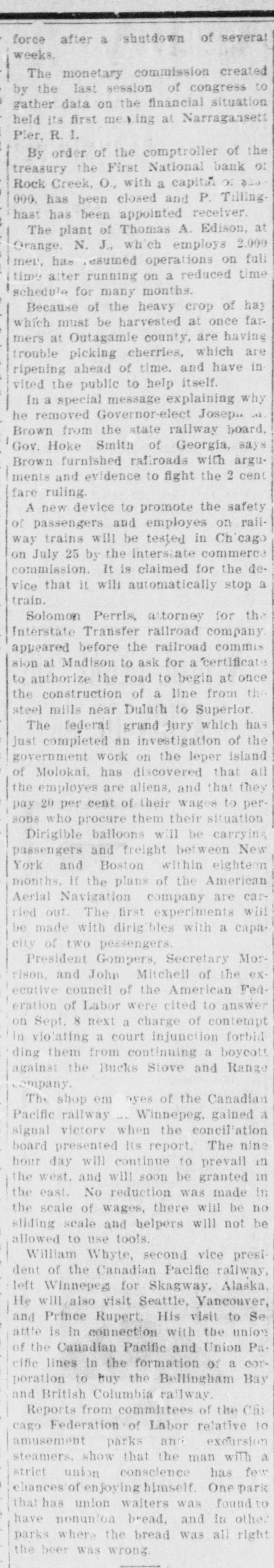 force after a shutdown of several weeks. The monetary commission created by the last session of congress to gather data on the financial situation held its first meaning at Narragansett Pier, R. I. By order of the comptroller of the treasury the First National bank of Rock Creek, O., with a capital or 000, has been closed and P. Tillinghast has been appointed receiver. The plant of Thomas A. Edison, at Orange, N. J., which employs 2,000 mer, has resumed operations on full time alter running on a reduced time schedule for many months. Because of the heavy crop of hay which must be harvested at once farmers at Outagamie county, are having trouble picking cherries, which are ripening ahead of time. and have in vited the public to help itself. In a special message explaining why he removed Governor-elect Joseph at. Brown from the state railway board, Gov. Hoke Smith of Georgia, says Brown furnished rafiroads with arguments and evidence to fight the 2 cent fare ruling. A new device to promote the safety of passengers and employes on railway trains will be tested in Ch'cago on July 25 by the interstate commerce commission. It is claimed for the device that it will automatically stop a train. Solomon Perris, attorney for the Interstate Transfer railroad company appeared before the railroad commis sion at Madison to ask for a certificate to authorize the road to begin at once the construction of a line from the steel mills near Duluth to Superior. The federal grand jury which has just completed an investigation of the government work on the leper island of Molokai, has discovered that all the employes are aliens, and that they pay 20 per cent of their wages to persons who procure them their situation Dirigible balloons will be carrying passengers and freight between New York and Boston within eighteen months, if the plans of the American Aerial Navigation company are carried out. The first experiments will be made with dirigibles with a capacity of two pessengers. President Gompers, Secretary Morrison, and John Mitchell of the executive council of the American Federation of Labor were cited to answer on Sept. 8 next a charge of contempt in violating a court injunction forbid ding them from continuing a boycott against the Bucks Stove and Range empany. The shop em ayes of the Canadian Pacific railway Winnepeg, gained a signal victory when the eoncil'ation board presented Its report. The nine hour day will continue to prevail in the west. and will soon be granted in the east. No reduction was made in the scale of wages, there will be no sliding scale and helpers will not be