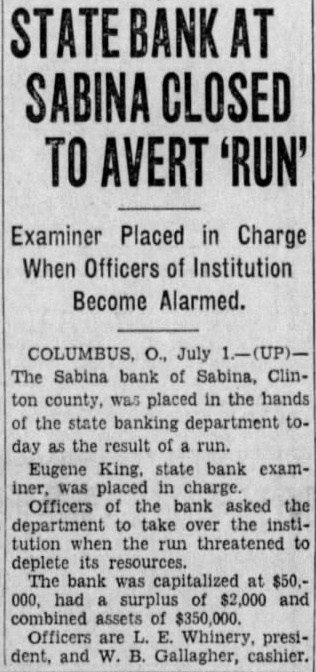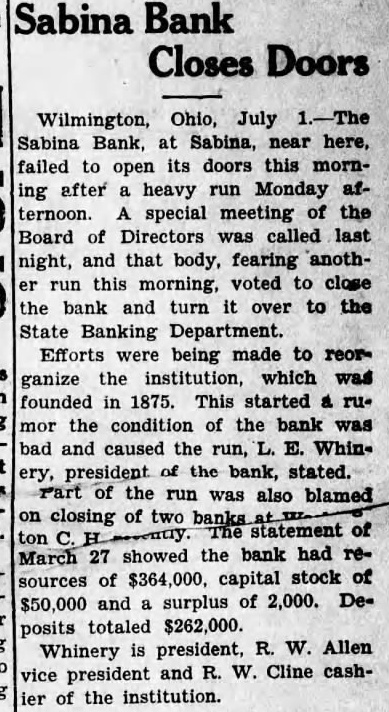 Wilmington, Ohio, July 1.-The Sabina Bank, at Sabina, near here, failed to open its doors this morning after a heavy run Monday afternoon. A special meeting of the Board of Directors was called last night, and that body, fearing another run this morning, voted to close the bank and turn it over to the State Banking Department. Efforts were being made to reorganize the institution, which was founded in 1875. This started a rumor the condition of the bank was bad and caused the run, L. E. Whinery, president of the bank, stated. Part of the run was also blamed on closing of two banks ton C. statement of March 27 showed the bank had resources of $364,000, capital stock of $50,000 and a surplus of 2,000. Deposits totaled $262,000. Whinery is president, R. W. Allen vice president and R. W. Cline cashier of the institution.