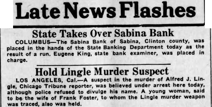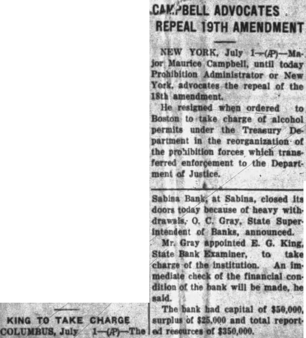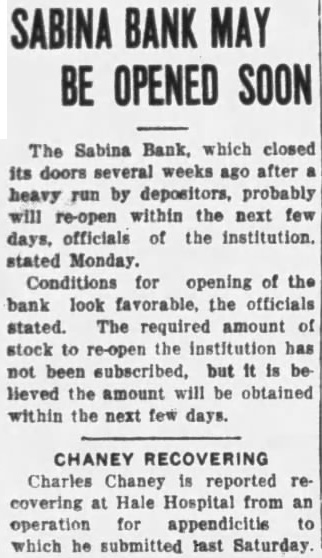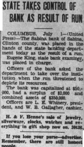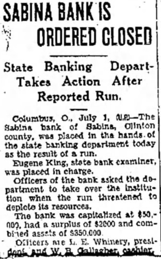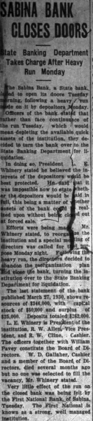 The Sabina Bank, a State bank. failed to open its doors Tuesday morning, following a heavy run made on It by depositors Monday. Officers of the bank stated that rather than face continuance of the run Tuesday, which would mean depleting the available quick assets of the institution, they decided to turn the bank over to the State Banking Department for 11. quidation. In doing 60, President E. Whinery stated he believed the in terests of the depositors would be was impossible now to state wheth er the depositors would be aid in full, this being matter of mether assets of the bank could Ised upon without being closed out at forced sale. Efforts were being mad Mr. Whinery stated, to reorgal the institution and special me ting of directors was called for nur pose Monday night. Following heavy run, the directors decided to abandon the resrganization plan and close the bank, turning the institution over to the State Banking The last statement of the bank published March 27, 1930, shows resources of $346,000, with capital stock of $50,000 and surplus of $25,000. Deposits totaled L. E. Whinery is President/of the institution, R. W. Allen Vice President, and R. W. Cline, Cashier. The officers together with William Pavey constitute the Board of Directors. W. D. Gallaher, Cashier and a member of the Board of DIrectors, died several months ago but no one was selected to fill the vacancy, Mr. Whinery stated. Very little effect of the run on the closed bank was being feit by the First National Bank, of Sabina, Tuesday. The First National Is known as strong, well managed institution.