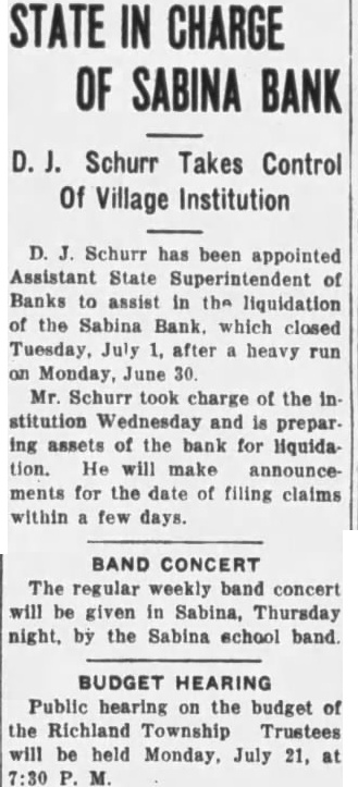 D. Schurr has been appointed Assistant State Superintendent of Banks to assist in the liquidation of the Sabina Bank. which closed Tuesday, July 1, after heavy run on Monday, June Mr. Schurr took charge of the in stitution Wednesday and is prepar. ing assets of the bank for liquidation. He will make announcements for the date of filing claims few days.