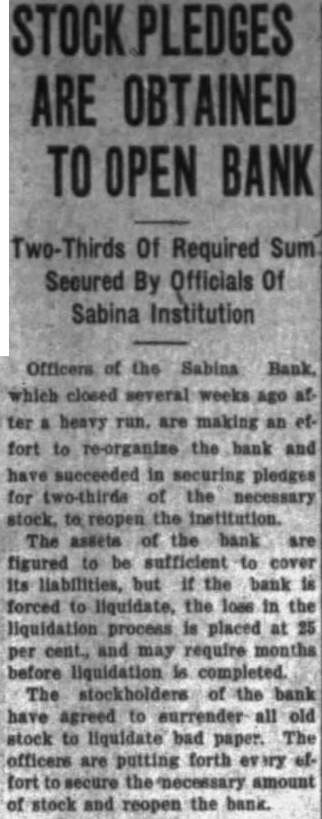 Officers of the Sabina Bank, which closed several weeks ago at ter a heavy run, are making an effort to re-organize the bank and have succeeded in securing pledges for two-thirds of the necessary stock, to reopen the institution. The assets of the bank are figured to be sufficient to cover its liabilities, but if the bank is forced to liquidate, the loss in the liquidation process is placed at 25 per cent., and may require months before liquidation is completed. The stockholders of the bank have agreed to surrender all old stock to liquidate bad paper. The officers are putting forth every of fort to secure the necessary amount of stock and reopen the bank.