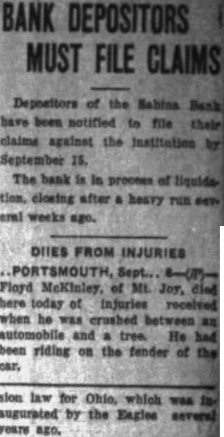 Floyd McKinley, Mt. Joy, here today of injuries received when he was crushed between automobile and He had been riding on the fender of the sion law for Ohio, which I augurated the years