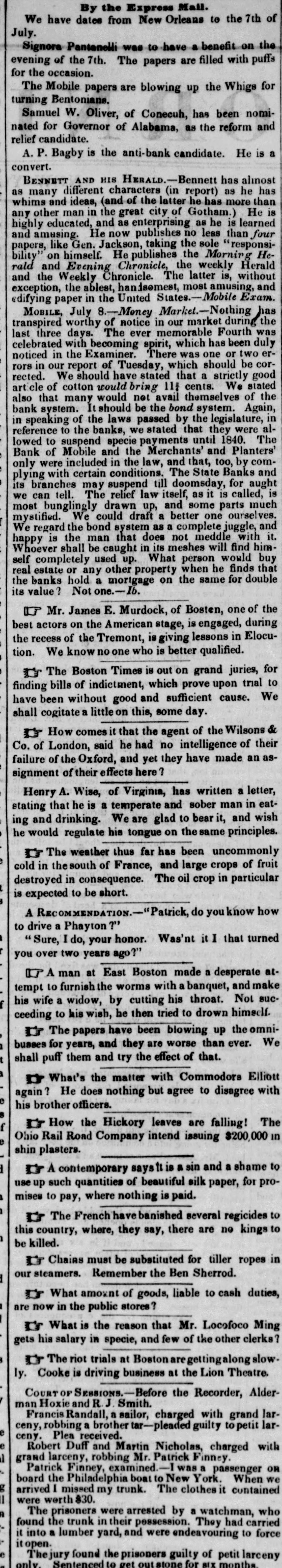 By the Express Mail. We have dates from New Orleans to the 7th of July. Signora Pantanelli was to have a benefit on the evening of the 7th. The papers are filled with puffs for the occasion. The Mobile papers are blowing up the Whigs for turning Bentonians. Samuel W. Oliver, of Conecuh, has been nominated for Governor of Alabama, as the reform and relief candidate. A. P. Bagby is the anti-bank candidate. He is a convert. BENNETT AND HIS HERALD.-Bennett has almost as many different characters (in report) as he has whims and ideas, (and of the latter he has more than any other man in the great city of Gotham.) He is highly educated, and as enterprising as he is learned and amusing. He now publishes no less than four papers, like Gen. Jackson, taking the sole responsibility' on himself. He publishes the Morning Herald and Evening Chronicle, the weekly Herald and the Weekly Chronicle. The latter is, without exception, the ablest, hanisemest, most amusing, and edifying paper in the United States.-Mobile Exam. MOBILE, July 8.-Money Market.-Nothing has transpired worthy of notice in our market during the last three days. The ever memorable Fourth was celebrated with becoming spirit, which has been duly noticed in the Examiner. There was one or two errors in our report of Tuesday, which should be corrected. We should have stated that a strictly good article of cotton would bring 11 cents. We stated also that many would not avail themselves of the bank system. It should be the bond system. Again, in speaking of the laws passed by the legislature, in reference to the banks, we stated that they were allowed to suspend specie payments until 1840. The Bank of Mobile and the Merchants' and Planters' only were included in the law, and that, too, by complying with certain conditions. The State Banks and its branches may suspend till doomsday, for aught we can tell. The relief law itself, as it is called, is most bunglingly drawn up, and some parts much mystified. We could draft a better one ourselves. We regard the bond system as a complete juggle, and happy is the man that does not meddle with it. Whoever shall be caught in its meshes will find himself completely used up. What person would buy real estate or any other property when he finds that the banks hold a mortgage on the same for double its value? Not one.-Ib. Mr. James E. Murdock, of Bosten, one of the best actors on the American stage, is engaged, during the recess of the Tremont, is giving lessons in Elocution. We know no one who is better qualified. D The Boston Times is out on grand juries, for finding bills of indictment, which prove upon trial to have been without good and sufficient cause. We shall cogitate little on this, some day. p How comesit that the agent of the Wilsons & Co. of London, said he had no intelligence of their failure of the Oxford, and yet they have made an assignment of their effects here? Henry A. Wise, of Virginia, has written a letter, stating that he is a temperate and sober man in eating and drinking. We are glad to bear it, and wish he would regulate his tongue on the same principles. Dr The weather thus far has been uncommonly cold in the south of France, and large crops of fruit destroyed in consequence. The oil crop in particular is expected to be short. A RECOMMENDATION-"Patrick do you know how to drive a Phayton? Sure, I do, your honor. Was'nt it I that turned you over two years ago?" I A man at East Boston made a desperate attempt to furnish the worms with a banquet, and make his wife a widow, by cutting his throat. Not sucf ceeding to his wish, he then tried to drown himself. The papers have been blowing up the omnih busses for years, and they are worse than ever. We t shall puff them and try the effect of that. a What's the matter with Commodors Elliott D again He does nothing but agree to disagree with e his brother officers. s Dr How the Hickory leaves are falling! The f Ohio Rail Road Company intend issuing $200,000 in shin plasters. I or A contemporary says it is a sin and a shame to use up such quantities of beautiful silk paper, for promises to pay, where nothing is paid. The French have banished several regicides to this country, where, they say, there are ne kings to be killed. or Chains must be substituted for tiller ropes in our steamers. Remember the Ben Sherrod. I What amount of goods, liable to cash duties, 1 are now in the public stores? or What is the reason that Mr. Locofoco Ming gets his salary in specie, and few of the other clerks? or The riot trials at Boston egettingalong slowly. Cooke is driving business at the Lion Theatre. COURT OF SESSIONS.-Before the Recorder, Alderman Hoxie and RJ Smith. Francis Randall, a sailor, charged with grand larceny, robbing a brother r-pleaded guilty to petit lare ceny. Plea received. Robert Duff and Martin Nicholas, charged with I grand larceny, robbing Mr. Patrick Finney. Patrick Finney, examined. was passenger OR board the Philadelphia boat to New York. When we g arrived I missed my trunk. The clothes it contained were worth $30. I The prisoners were arrested by a watchman, who found the trunk in their possession. They had carried it into a lumber yard, and were endeavouring to force it open. The jury found the prisoners guilty of petit larceny only. Sentenced for six months.