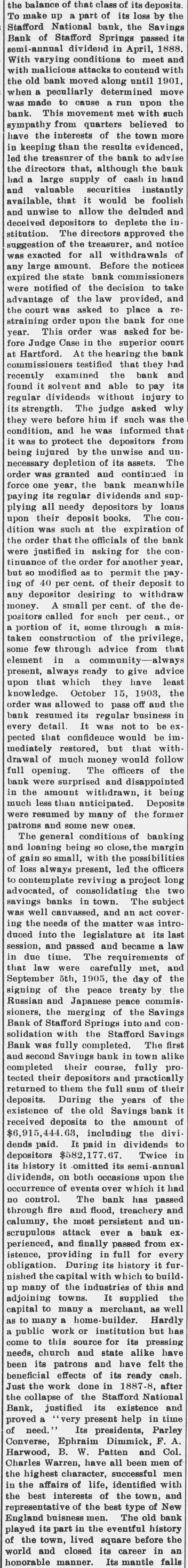 emi-annual dividend in April, 1888. Vith varying conditions to meet and ith malicious attacks to contend with old bank moved along until 1901, hen a peculiarly determined move made to cause a run upon the ank. This movement met with such ympathy from quarters believed to the interests of the town more keeping than the results evidenced, the treasurer of the bank to advise directors that, although the bank a large supply of cash in hand valuable securities instantly vailable, that it would be foolish unwise to allow the deluded and eceived depositors to deplete the in titution. The directors approved the aggestion of the treasurer, and notice exacted for all withdrawals of large amount. Before the notices xpired the state bank commissioners notified of the decision to take dvantage of the law provided, and court was asked to place a retraining order upon the bank for one This order was asked for beJudge Case in the superior court Hartford. At the hearing the bank ommissioners testified that they had ecently examined the bank and bund it solvent and able to pay its egular dividends without injury to strength. The judge asked why hey were before him if such was the ondition, and he was informed that was to protect the depositors from eing injured by the unwise and un ecessary depletion of its assets. The rder was granted and continued in one year, the bank meanwhile aying its regular dividends and suplying all needy depositors by loans their deposit books. The conwas such at the expiration of order that the officials of the bank justified in asking for the con inuance of the order for another year, 80 modified as to permit the pay of 40 per cent. of their deposit to depositor desiring to withdraw honey. A small per cent. of the deositors called for such per cent., or portion of it, some through a misaken construction of the privilege, few through advice from that lement in a community-always resent, always ready to give advice that which they have least nowledge. October 15, 1903, the rder was allowed to pass off and the resumed its regular business in very detail. It was not to be exected that confidence would be imediately restored, but that with. rawal of much money would follow opening. The officers of the were surprised and disappointed the amount withdrawn, it being nuch less than anticipated. Deposits resumed by many of the former atrons and some new ones. The general conditions of banking loaning being SO close, the margin gain SO small, with the possibilities loss always present, led the officers contemplate reviving a project long dvocated, of consolidating the two avings banks in town. The subject well canvassed, and an act cover the needs of the matter was introuced into the legislature at its last ession, and passed and became a law due time. The requirements of law were carefully met, and eptember 5th, 1905, the day of the igning of the peace treaty by the ussian and Japanese peace commisioners, the merging of the Savings Bank of Stafford Springs into and con olidation with the Stafford Savings Bank was fully completed. The first second Savings bank in town alike ompleted their course, fully proected their depositors and practically eturned to them the full sum of their eposits. During the years of the xistence of the old Savings bank it eceived deposits to the amount of 6,915,444.63, including the diviends paid. It paid in dividends to epositors $582,177.67. Twice in history it omitted its semi-annual ividends, on both occasions upon the ccurrence of events over which it had control. The bank has passed brough fire and flood, treachery and alumny, the most persistent and uncrupulous attack ever a bank exerienced, and finally passed from ex. stence, providing in full for every bligation. During its history it furished the capital with which to build many of the industries of this and djoining towns. It supplied the apital to many a merchant, as well to many a home-builder. Hardly