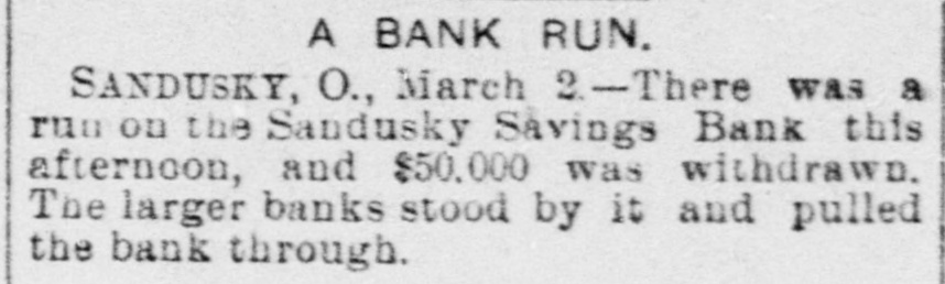 A BANK RUN. SANDUSKY, O., March 2-There was a ruu on the Sandusky Savings Bank this afternoon, and $50,000 was withdrawn. The larger banks stood by it and pulled the bank through.