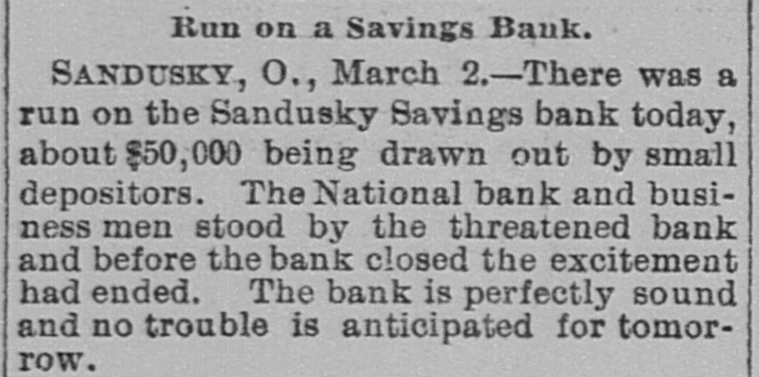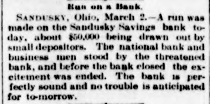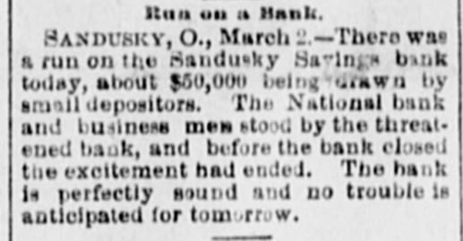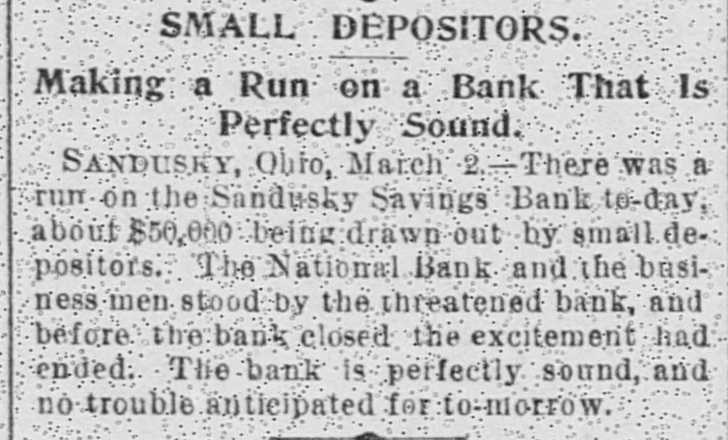 SMALL DEPOSITORS. Making a Run on a Bank That Is Perfectly Sound. SANDUSKY, Ohio, March 2-There was a rum on the Sandusky Savings Bank to-day, about $50,000 being dräwn out by small depositors. The National Bank and the basiness men stood by the threatened bank, and before the bank closed the excitement had ended: The bank is perfectly sound, and no trouble anticipated for to-morrow.
