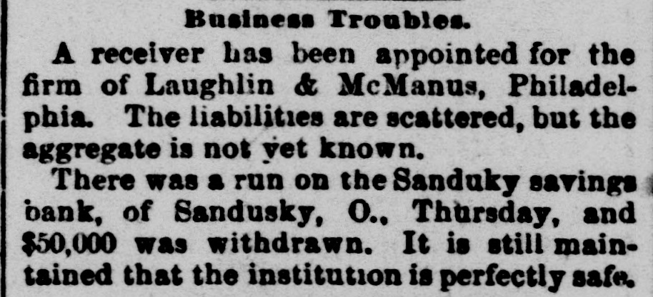 Business Troubles. A receiver has been appointed for the firm of Laughlin & McManus, Philadelphia. The liabilities are scattered, but the aggregate is not vet known. There was a run on the Sanduky savings bank, of Sandusky, 0.. Thursday, and $50,000 was withdrawn. It is still maintained that the institution is perfectly safe.