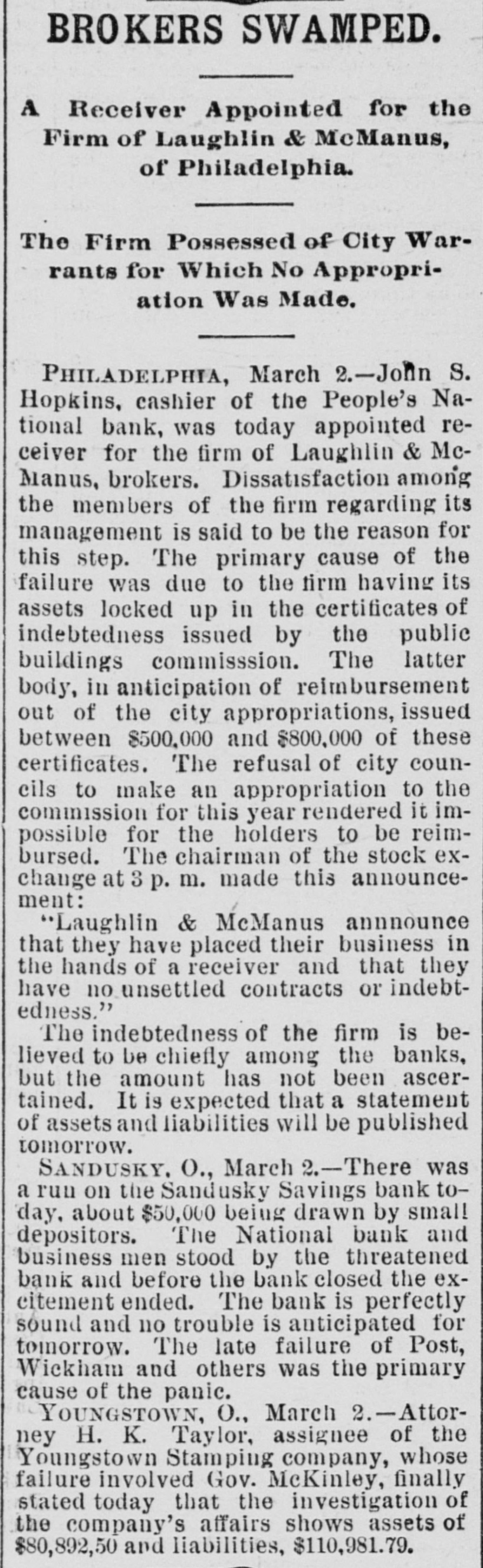BROKERS SWAMPED. A Receiver Appointed for the Firm of Laughlin & McManus, of Philadelphia. The Firm Possessed of City Warrants for Which No Appropriation Was Made. PHILADELPHYA, March 2.-John S. Hopkins, cashier of the People's National bank, was today appointed receiver for the firm of Laughlin & McManus, brokers. Dissatisfaction among the members of the firm regarding its management is said to be the reason for this step. The primary cause of the failure was due to the firm having its assets locked up in the certificates of indebtedness issued by the public buildings commission. The latter body, in anticipation of reimbursement out of the city appropriations, issued between $500,000 and $800,000 of these certificates. The refusal of city councils to make an appropriation to the commission for this year rendered it impossible for the holders to be reimbursed. The chairman of the stock exchange at 3 p. m. made this announcement: "Laughlin & McManus annnounce that they have placed their business in the hands of a receiver and that they have no unsettled contracts or indebtedness." The indebtedness of the firm is believed to be chiefly among the banks, but the amount has not been ascertained. It is expected that a statement of assets and liabilities will be published tomorrow. SANDUSKY. O., March 2.-There was a run on the Sandusky Savings bank today, about $50,000 being drawn by small depositors. The National bank and business men stood by the threatened bank and before the bank closed the exeitement ended. The bank is perfectly sound and no trouble is anticipated for tomorrow. The late failure of Post, Wickham and others was the primary cause of the panic. YOUNGSTOWN, O., March 2.-Attorney H. K. Taylor, assignee of the Youngstown Stamping company, whose failure involved Gov. McKinley, finally stated today that the investigation of the company's affairs shows assets of $80,892.50 and liabilities, $110,981.79.