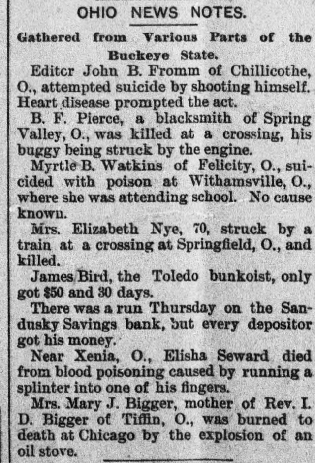 OHIO NEWS NOTES. Gathered from Various Parts of the Buckeye State. Editcr John B. Fromm of Chillicothe, O., attempted suicide by shooting himself. Heart disease prompted the act. B. F. Pierce, a blacksmith of Spring Valley, O., was killed at a crossing, his buggy being struck by the engine. Myrtle B. Watkins of Felicity, O., suicided with poison at Withamsville, O., where she was attending school. No cause known. Mrs. Elizabeth Nye, 70, struck by a train at a crossing at Springfield, O., and killed. James Bird, the Toledo bunkoist, only got $50 and 30 days. There was a run Thursday on the Sandusky Savings bank, but every depositor got his money. Near Xenia, O., Elisha Seward died from blood poisoning caused by running a splinter into one of his fingers. Mrs. Mary J. Bigger, mother of Rev. I. D. Bigger of Tiffin, O., was burned to death at Chicago by the explosion of an oil stove.