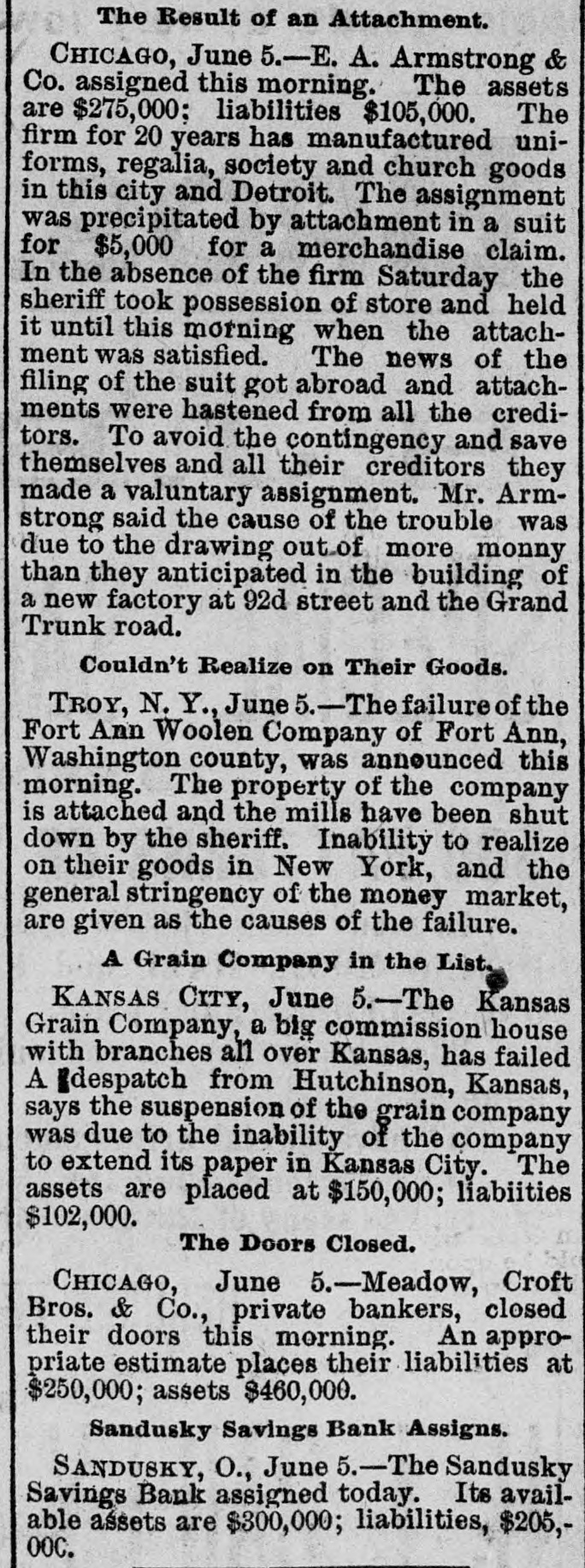 The Result of an Attachment. CHICAGO, June 5.-E. A. Armstrong & Co. assigned this morning. The assets are $275,000; liabilities $105,000. The firm for 20 years has manufactured uniforms, regalia, society and church goods in this city and Detroit. The assignment was precipitated by attachment in a suit for $5,000 for a merchandise claim. In the absence of the firm Saturday the sheriff took possession of store and held it until this morning when the attachment was satisfied. The news of the filing of the suit got abroad and attachments were hastened from all the creditors. To avoid the contingency and save themselves and all their creditors they made a valuntary assignment. Mr. Armstrong said the cause of the trouble was due to the drawing out of more monny than they anticipated in the building of a new factory at 92d street and the Grand Trunk road. Couldn't Realize on Their Goods. TROY, N. Y., June .-The failure of the Fort Ann Woolen Company of Fort Ann, Washington county, was announced this morning. The property of the company is attached and the mills have been shut down by the sheriff. Inability to realize on their goods in New York, and the general stringency of the money market, are given as the causes of the failure. A Grain Company in the List. KANSAS CITY, June 5.-The Kansas Grain Company, a big commission house with branches all over Kansas, has failed A despatch from Hutchinson, Kansas, says the suspension of the grain company was due to the inability of the company to extend its paper in Kansas City. The assets are placed at $150,000; liabiities $102,000. The Doors Closed. CHICAGO, June 5.-Meadow, Croft Bros. & Co., private bankers, closed their doors this morning. An appropriate estimate places their liabilities at $250,000; assets $460,000. Sandusky Savings Bank Assigns. SANDUSKY, O., June - -The Sandusky Savings Bank assigned today. Its available assets are $300,000; liabilities, $205,OOC.