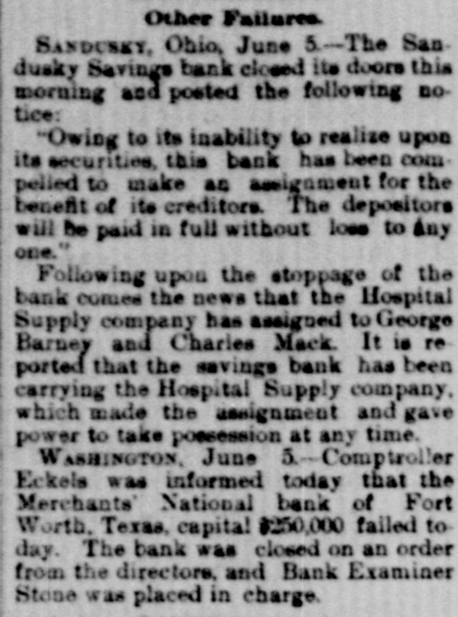 Other Failures SANDUSKY. Ohio, June 5.-The San dusky Savings bank closed its doors this morning and posted the following notice: "Owing to its inability to realize upon its securities, this bank has been compelled to make as assignment for the benefit of its creditors. The depositors will be paid in full without loss to any one." Following upon the stoppage of the bank comes the news that the Hospital Supply company has assigned to George Barney and Charles Mack. It is re ported that the savings bank has been carrying the Hospital Supply company. which made the assignment and gave power to take possession at any time. WASHINGTON, June 5. Comptroller Eckels was informed today that the Merchants' National bank of Fort Worth. Texas, capita! $250,000 failed to day. The bank was closed on an order from the directors, and Bank Examiner Stone was placed in charge.