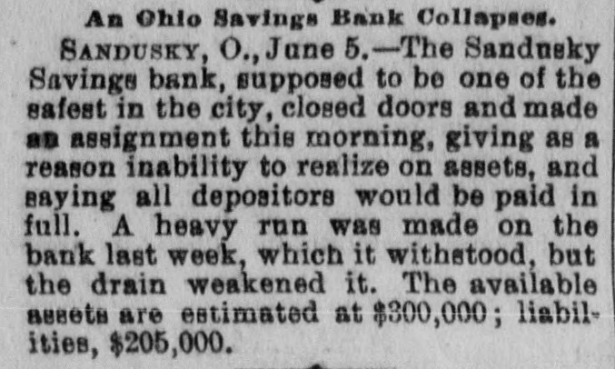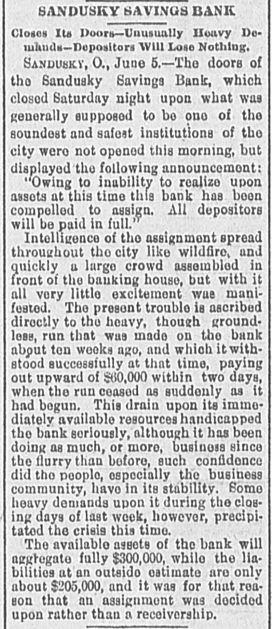 SANDUSKY SAVINGS BANK Closes Its Doors-Unusually Hoavy Deminds-Depositors Will Lose Nothing. SANDUSKY, O., June 5.-The doors of the Sandusky Savings Bank, which closed Saturday night upon what was generally supposed to be one of the soundest and safest institutions of the city were not opened this morning, but displayed the following announcement: "Owing to inability to realize upon assets at this time this bank has been compelled to assign. All depositors will be paid in full." Intelligence of the assignment spread throughout the city like wildfire, and quickly a large crowd assembled in front of the banking house, but with it all very little excitement wae manifested. The present trouble is ascribed directly to the heavy, though groundless, run that was made on the bank about ten weeks ago, and which it withstood successfully at that time, paying out upward of $60,000 within two days, when the run ceased as suddenly as it had begun. This drain upon its immediately available resources handicapped the bank seriously, although it has been doing as much, or more, business since the flurry than before, such confidence did the people, especially the business community, have in its stability. Some heavy demands upon it during the closing days of last week, however, precipitated the crisis this time. The available assets of the bank will aggregate fully $300,000, while the liabilities at an outsido eatimate are only about $205,000, and it was for that reason that an assignment was decided upon rather than a receivership.