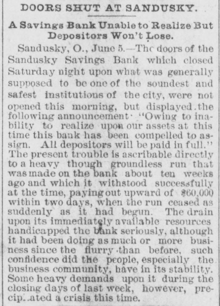 DOORS SHUT AT SANDUSKY. A Savings Bank Unable to Realize But Depositors Won't Lose. Sandusky, O., June .-The doors of the Sandusky Savings Bank which closed Saturday night upon what was generally supposed to be one of the soundest and safest institutions of the city, were not opened this morning, but displayed. the following announcement "Owing to inability to realize upon our assets at this time this bank has been compelled to assign. All depositors will be paid in full." The present trouble is ascribable directly to a heavy though groundless run that was made on the bank about ten weeks ago and which it withstood successfully at the time, paying out upward of $60,000 within two days, when the run ceased as suddenly as it had begun. The drain upon its immediately available resources handicapped the bank seriously, although it had been doing as much or more business since the flurry than before, such confidence did the people, especially the business community, have in its stability. Some heavy demands upon it during the closing days of last week, however, precip. ated a crisis this time.